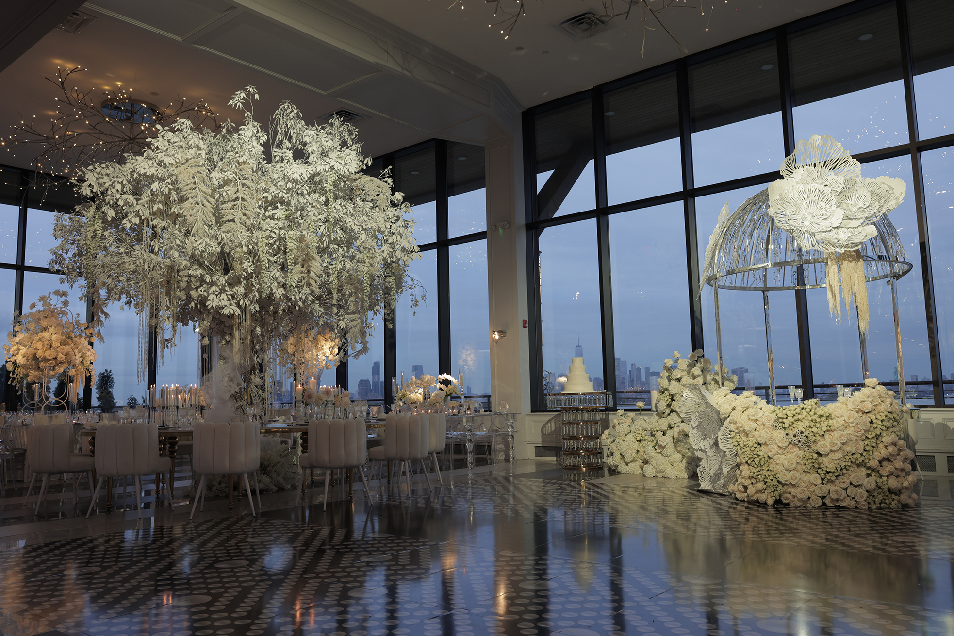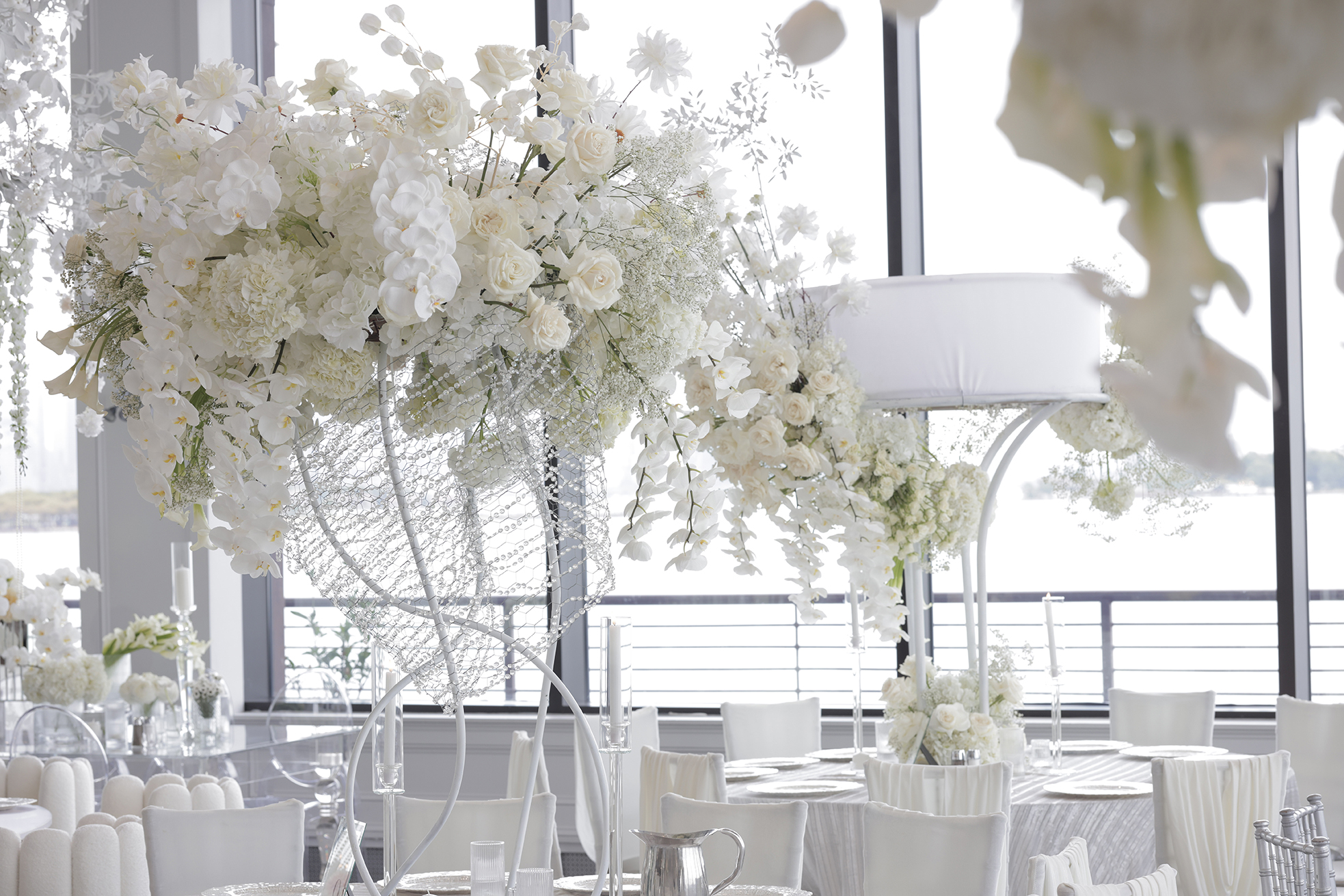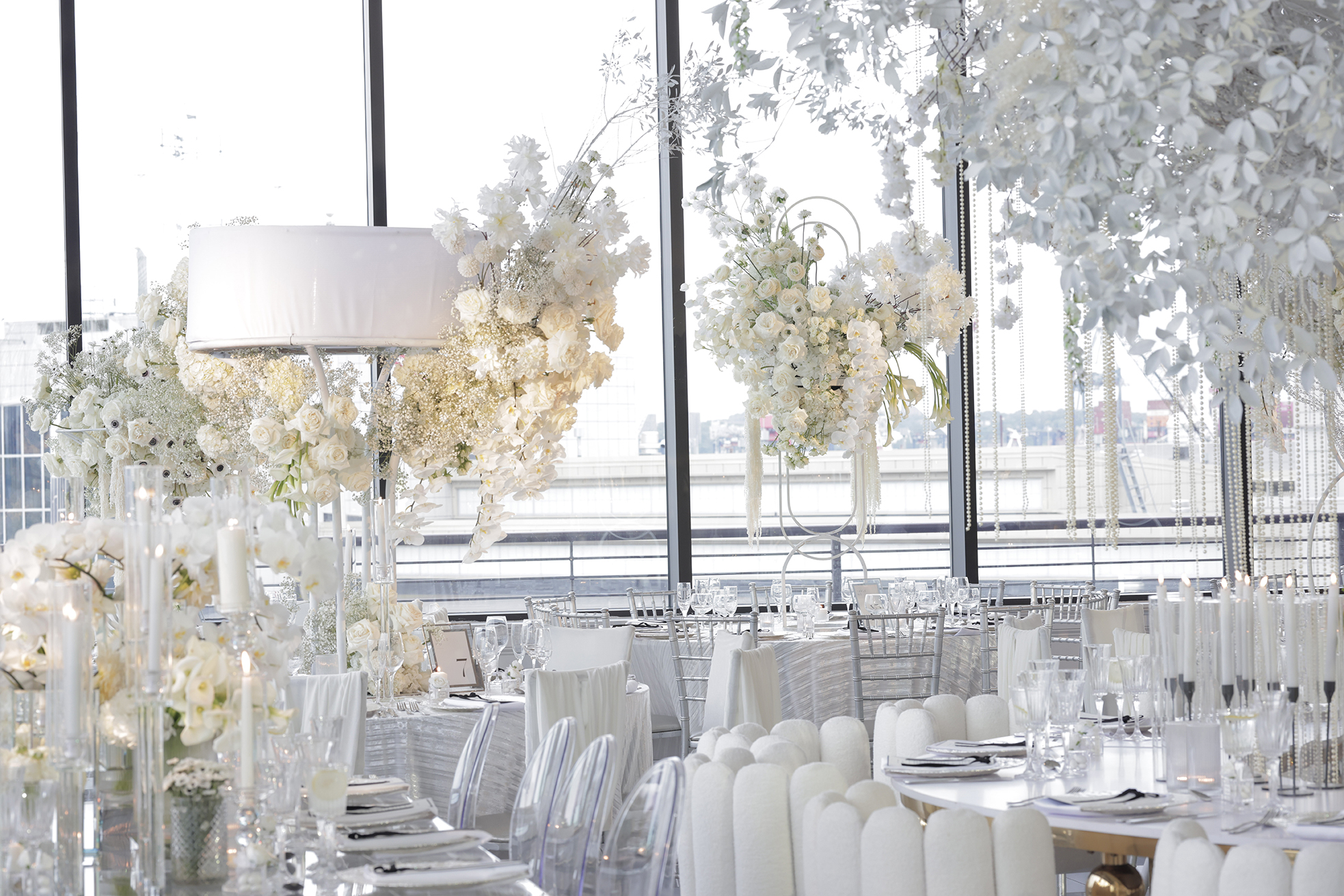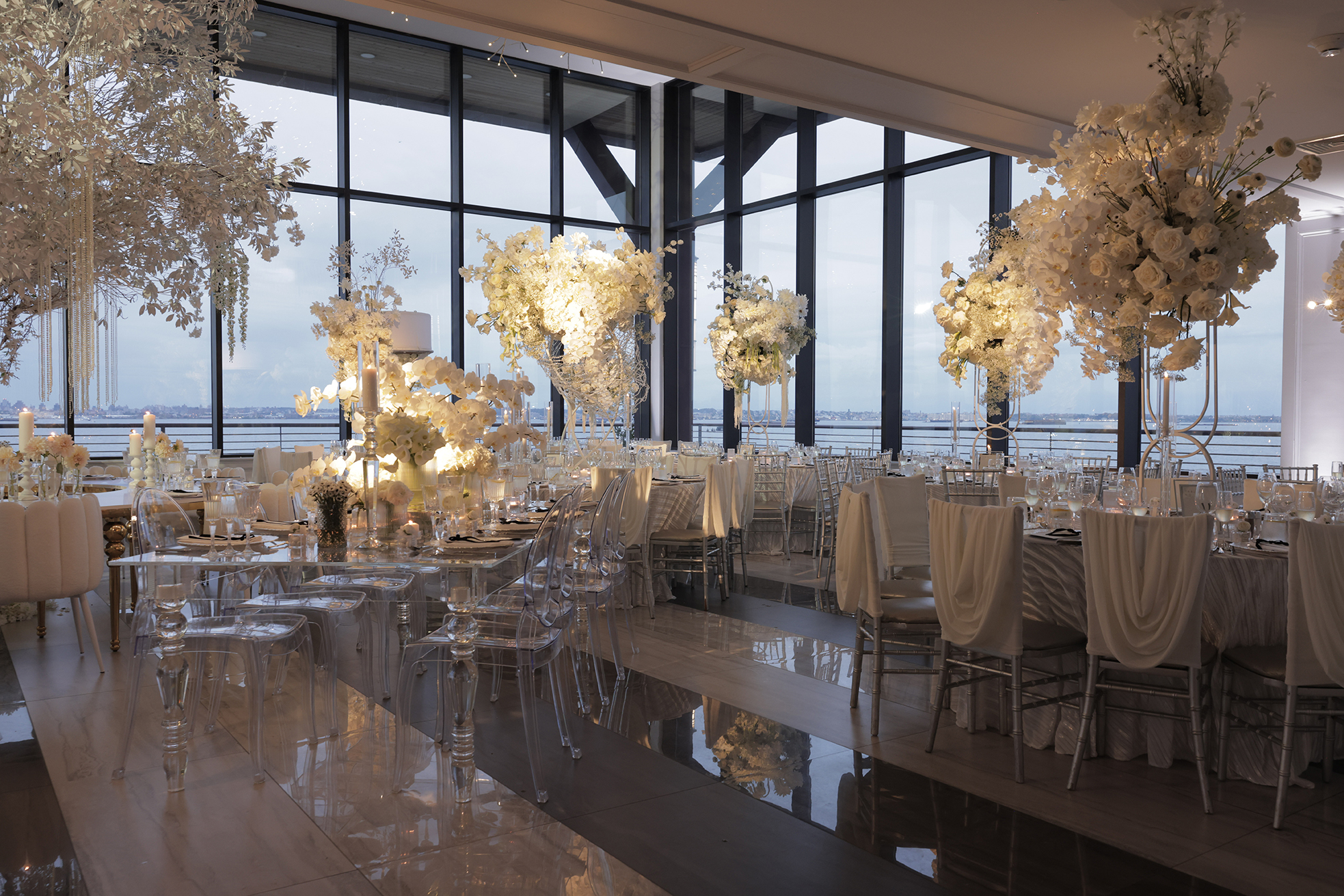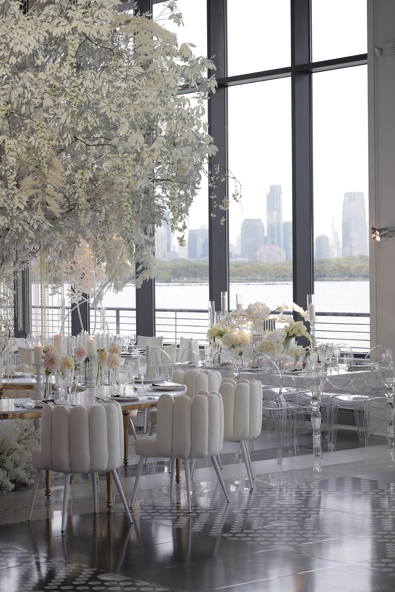 We had the honor of contributing to Carolyn and Nick’s breathtaking wedding at the stunning Hudson House in Jersey City, NJ. Collaborating with the talented teams at Sarcon Flower Couture and impeccable photos captured by MHM Photography, we transformed the venue into a scene of elegance and sophistication. The centerpiece of the design featured our Kleopatra Donut white top tables, beautifully paired with White Magnolia Chairs, creating a modern yet timeless aesthetic. Positioned nearby, our Adeline Clear Table, surrounded by Luna Clear Chairs, added a touch of refined glamour, framing the dance floor with an inviting and chic atmosphere. Included in our amazing decor our elegant Crystaline Decorative Cake table to showcase the couple’s beautiful cake.