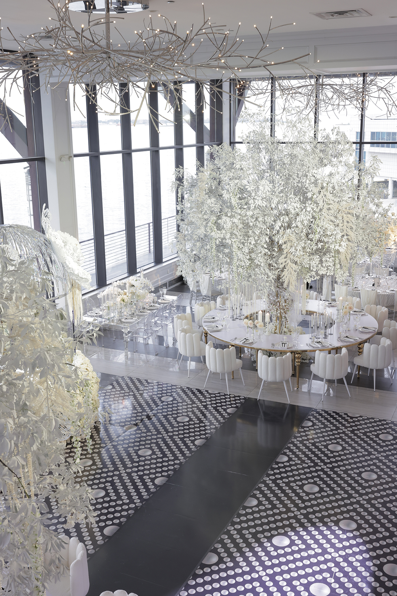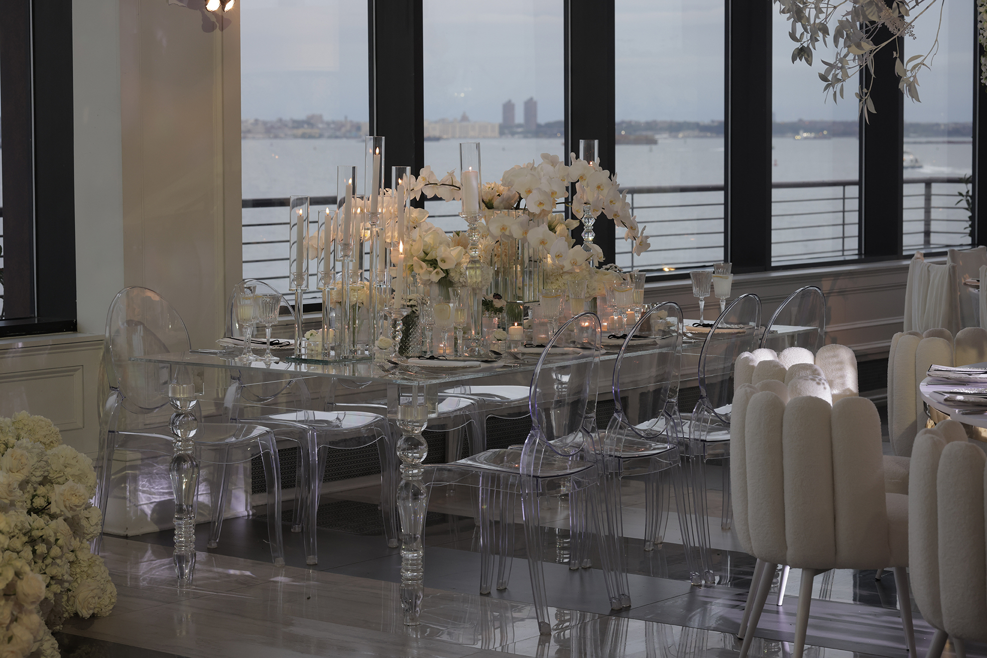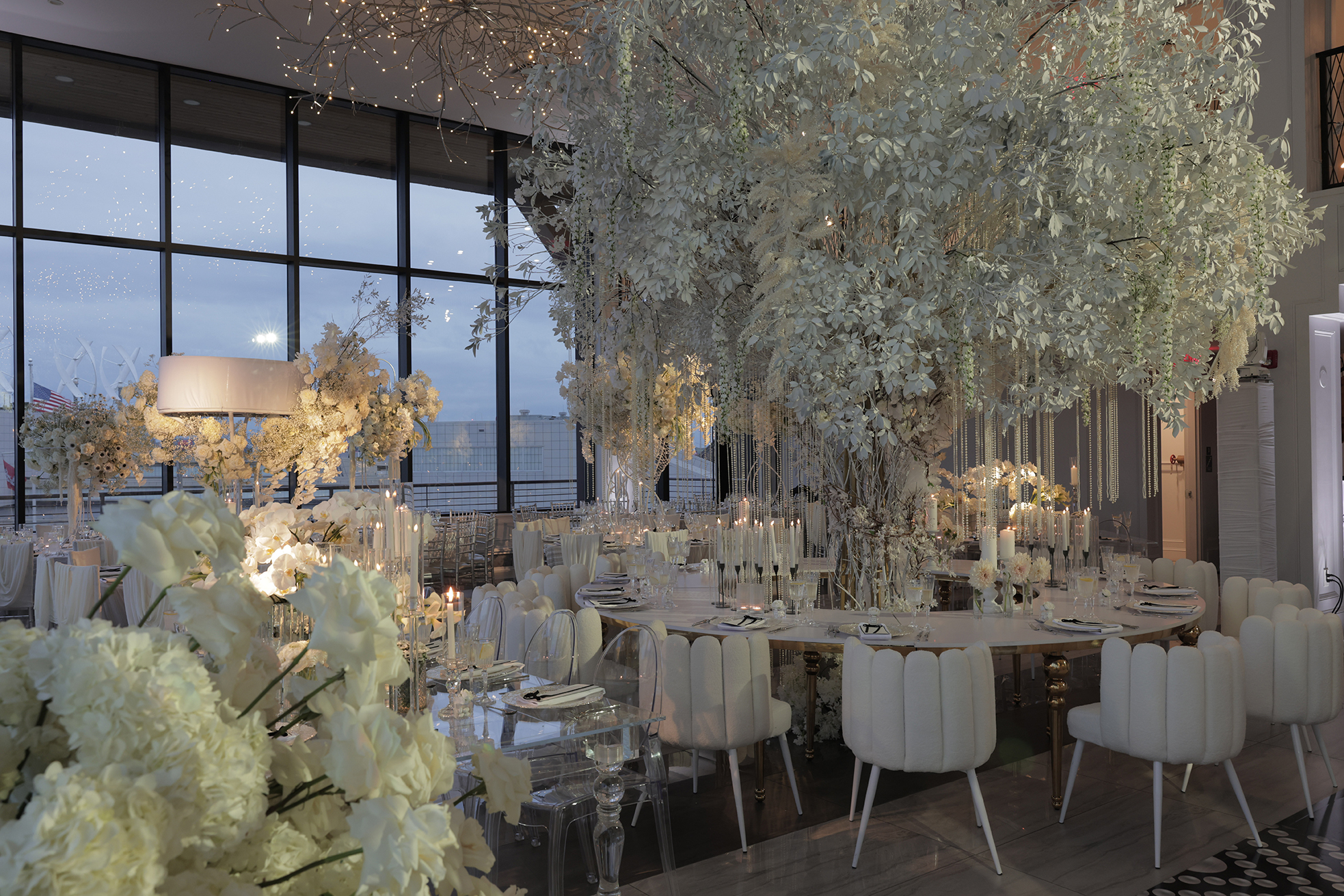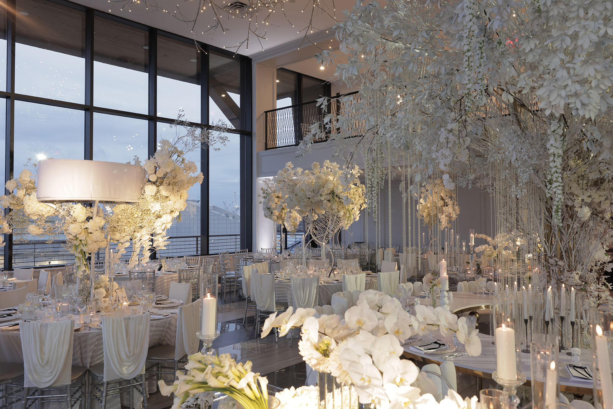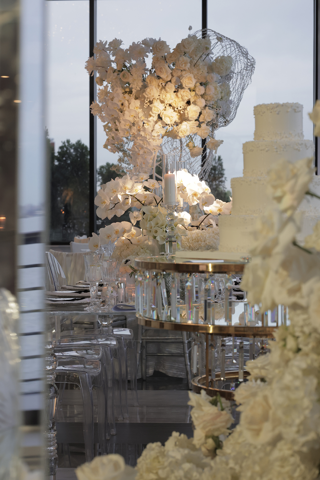 We had the honor of contributing to Carolyn and Nick’s breathtaking wedding at the stunning Hudson House in Jersey City, NJ. Collaborating with the talented teams at Sarcon Flower Couture and impeccable photos captured by MHM Photography, we transformed the venue into a scene of elegance and sophistication. The centerpiece of the design featured our Kleopatra Donut white top tables, beautifully paired with White Magnolia Chairs, creating a modern yet timeless aesthetic. Positioned nearby, our Adeline Clear Table, surrounded by Luna Clear Chairs, added a touch of refined glamour, framing the dance floor with an inviting and chic atmosphere. Included in our amazing decor our elegant Crystaline Decorative Cake table to showcase the couple’s beautiful cake.