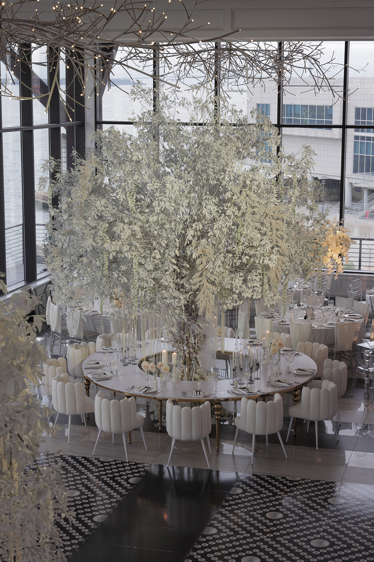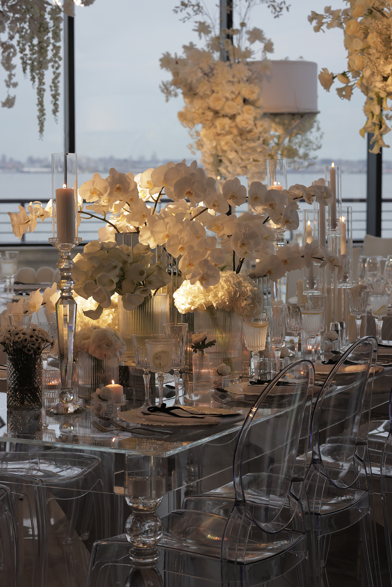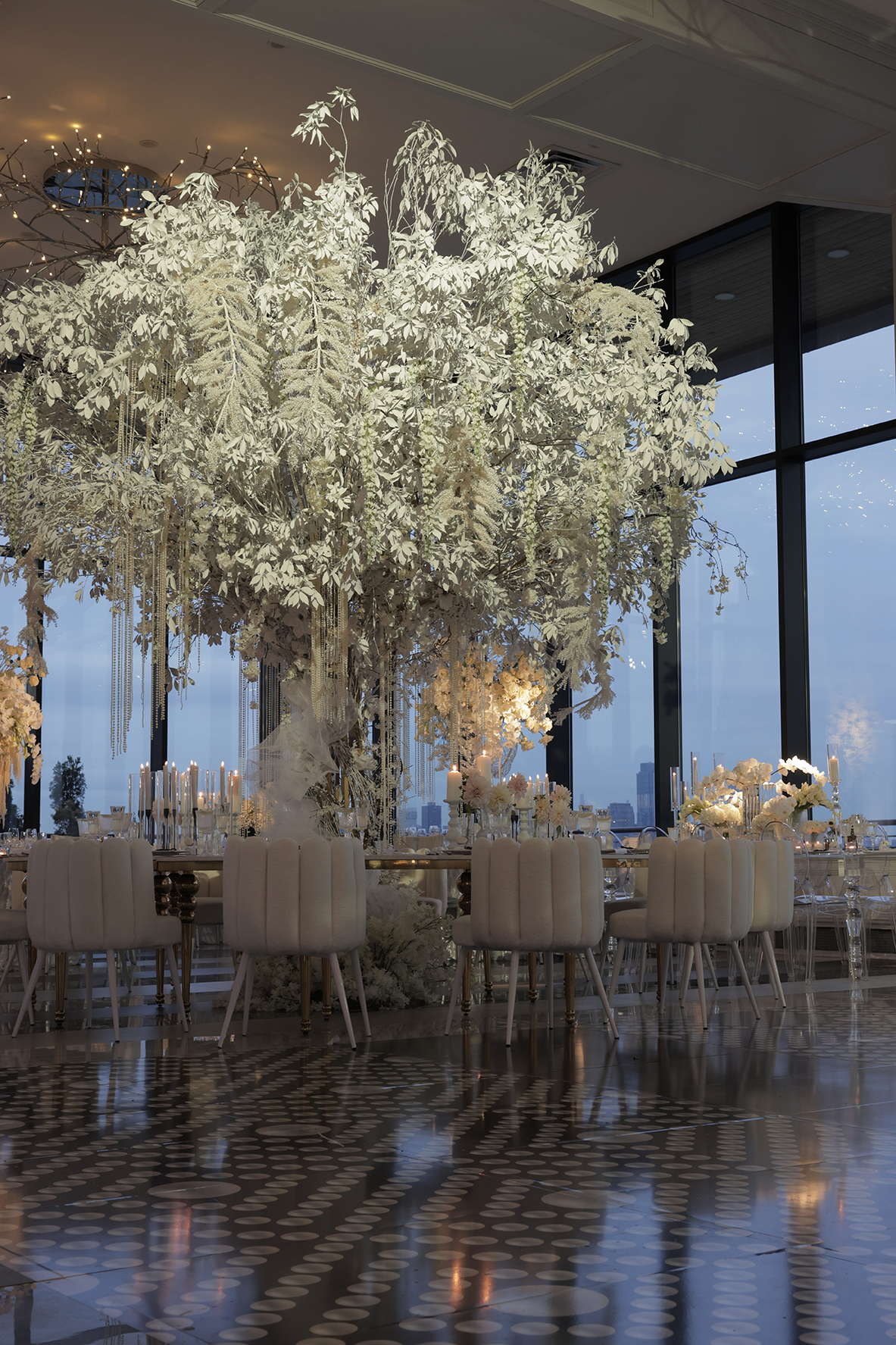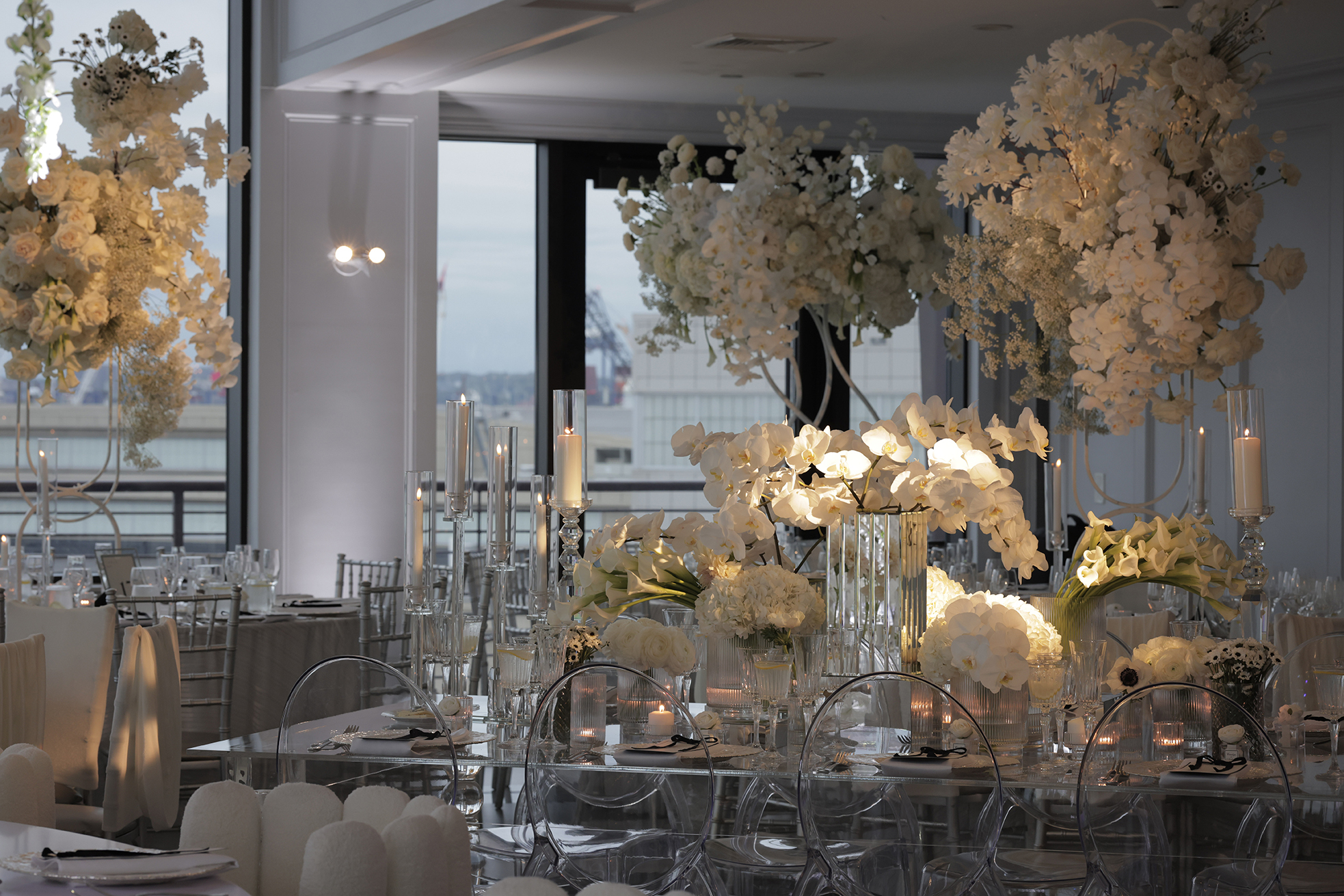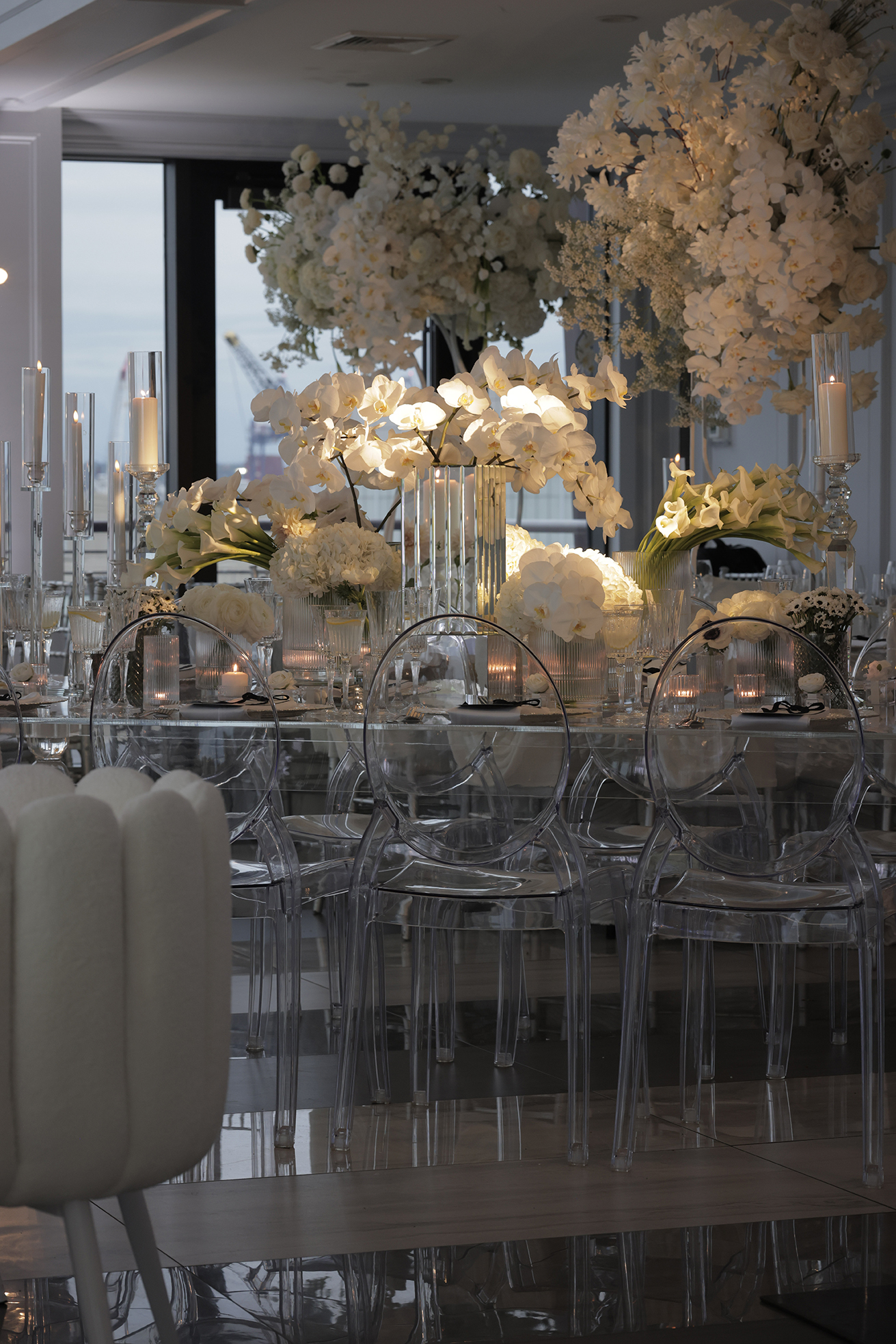 We had the honor of contributing to Carolyn and Nick’s breathtaking wedding at the stunning Hudson House in Jersey City, NJ. Collaborating with the talented teams at Sarcon Flower Couture and impeccable photos captured by MHM Photography, we transformed the venue into a scene of elegance and sophistication. The centerpiece of the design featured our Kleopatra Donut white top tables, beautifully paired with White Magnolia Chairs, creating a modern yet timeless aesthetic. Positioned nearby, our Adeline Clear Table, surrounded by Luna Clear Chairs, added a touch of refined glamour, framing the dance floor with an inviting and chic atmosphere. Included in our amazing decor our elegant Crystaline Decorative Cake table to showcase the couple’s beautiful cake.