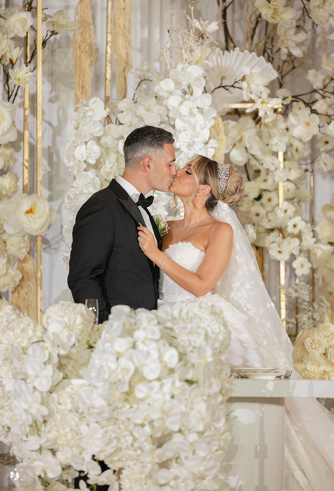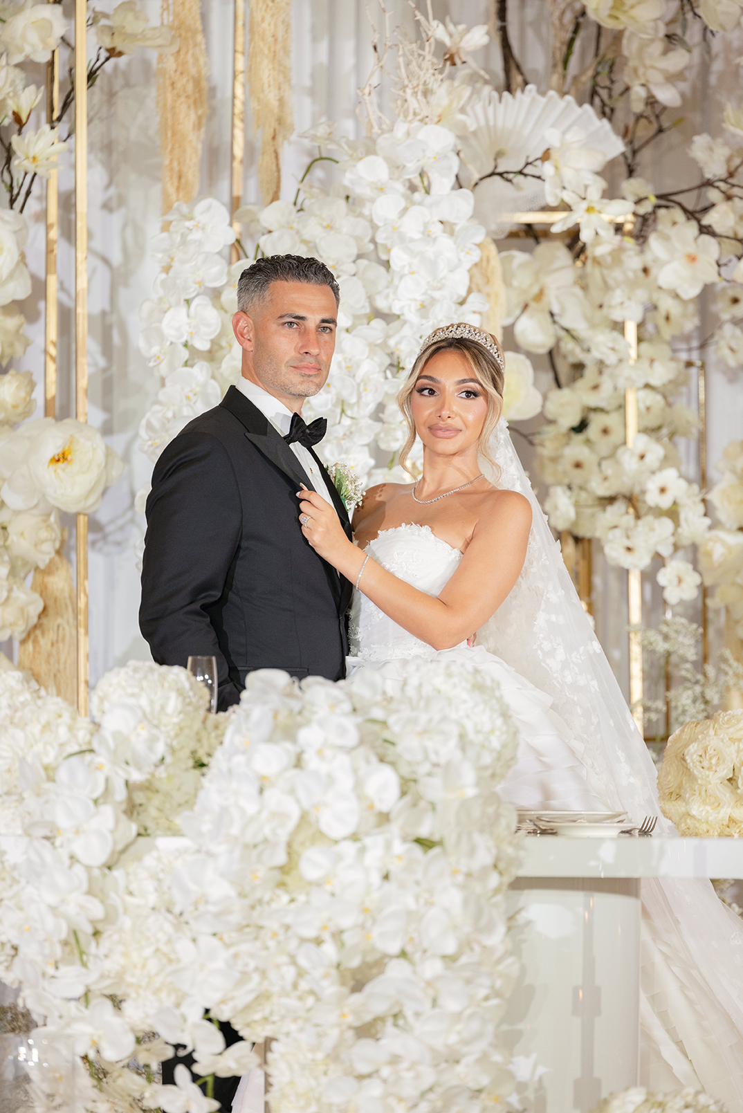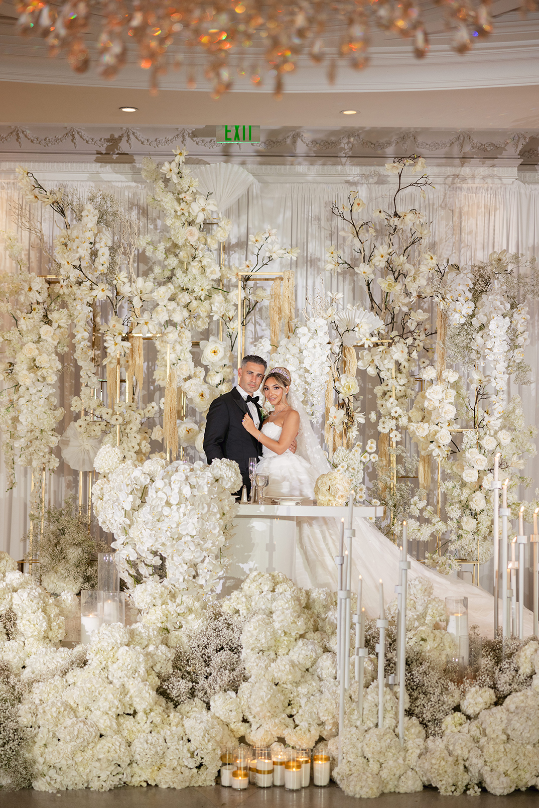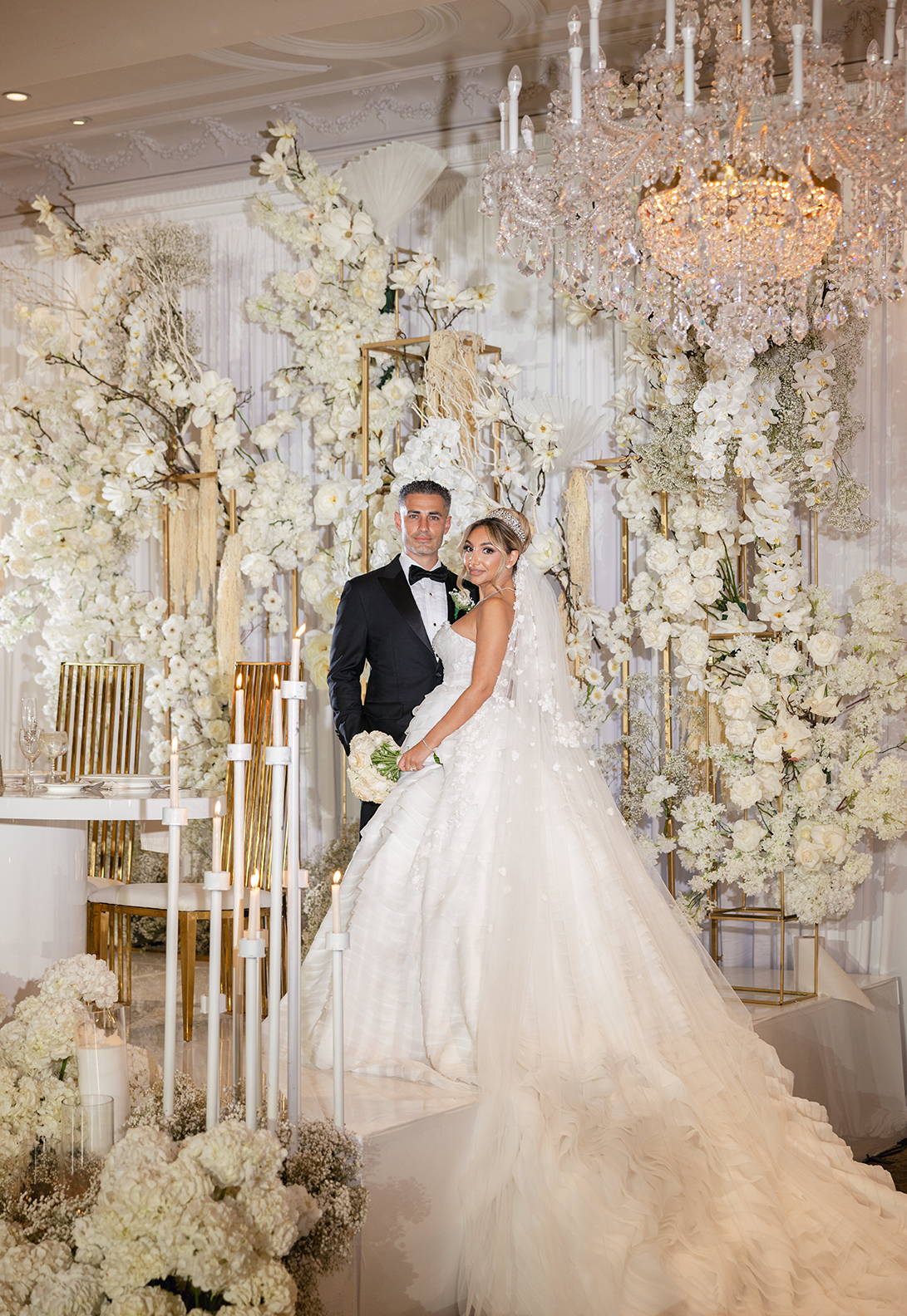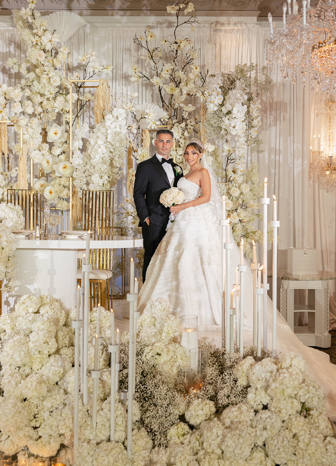 The couple also chose our house-style draping to serve as a stunning backdrop for family portraits, creating the perfect frame for their cherished memories. The reception featured a white acrylic stage with our elegant Graceland sweetheart table, accompanied by a soft white drapery behind the stage, setting a serene and intimate atmosphere for the newlyweds. To elevate the overall ambiance, Melissa and Carmine opted for our premium lighting rentals, which illuminated the stage with a soft, romantic glow, while also pin-spotlighting the masterfully designed centerpieces created by Sarcon Flower Couture, adding depth and radiance to every floral arrangement. The result was a wedding that exuded timeless elegance, where every detail—down to the lighting—came together to highlight the couple’s love in the most beautiful way.