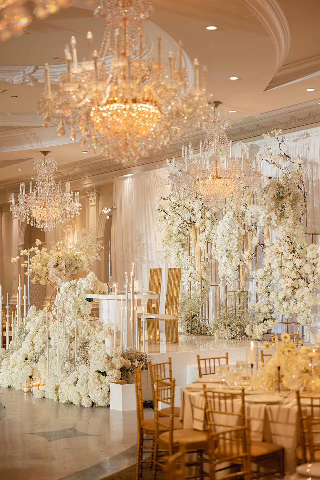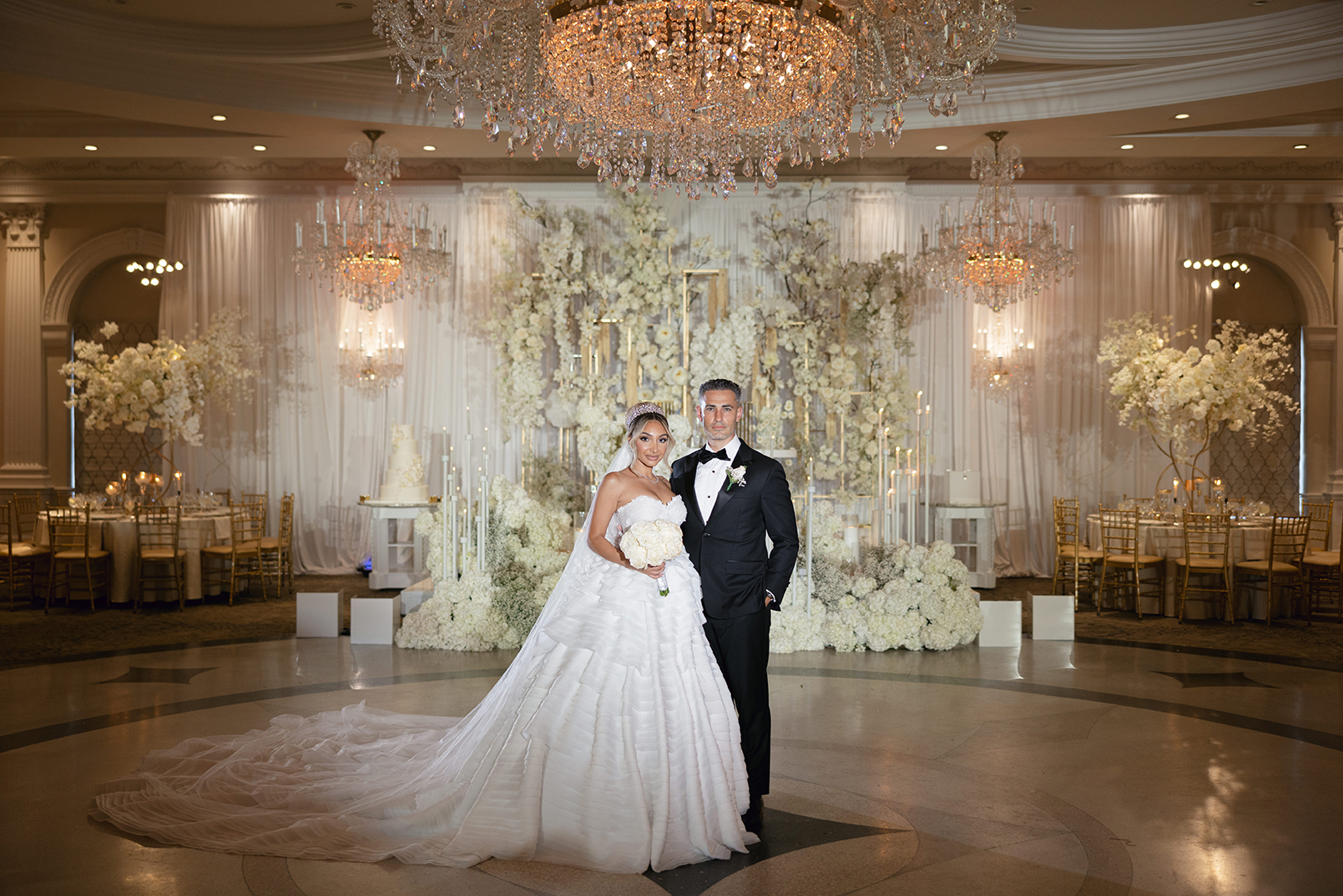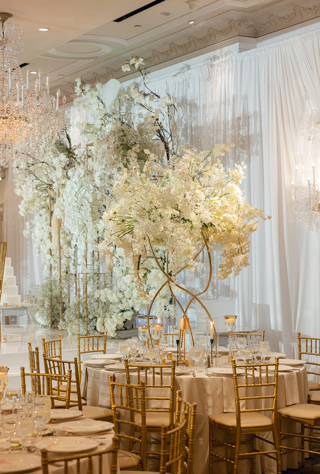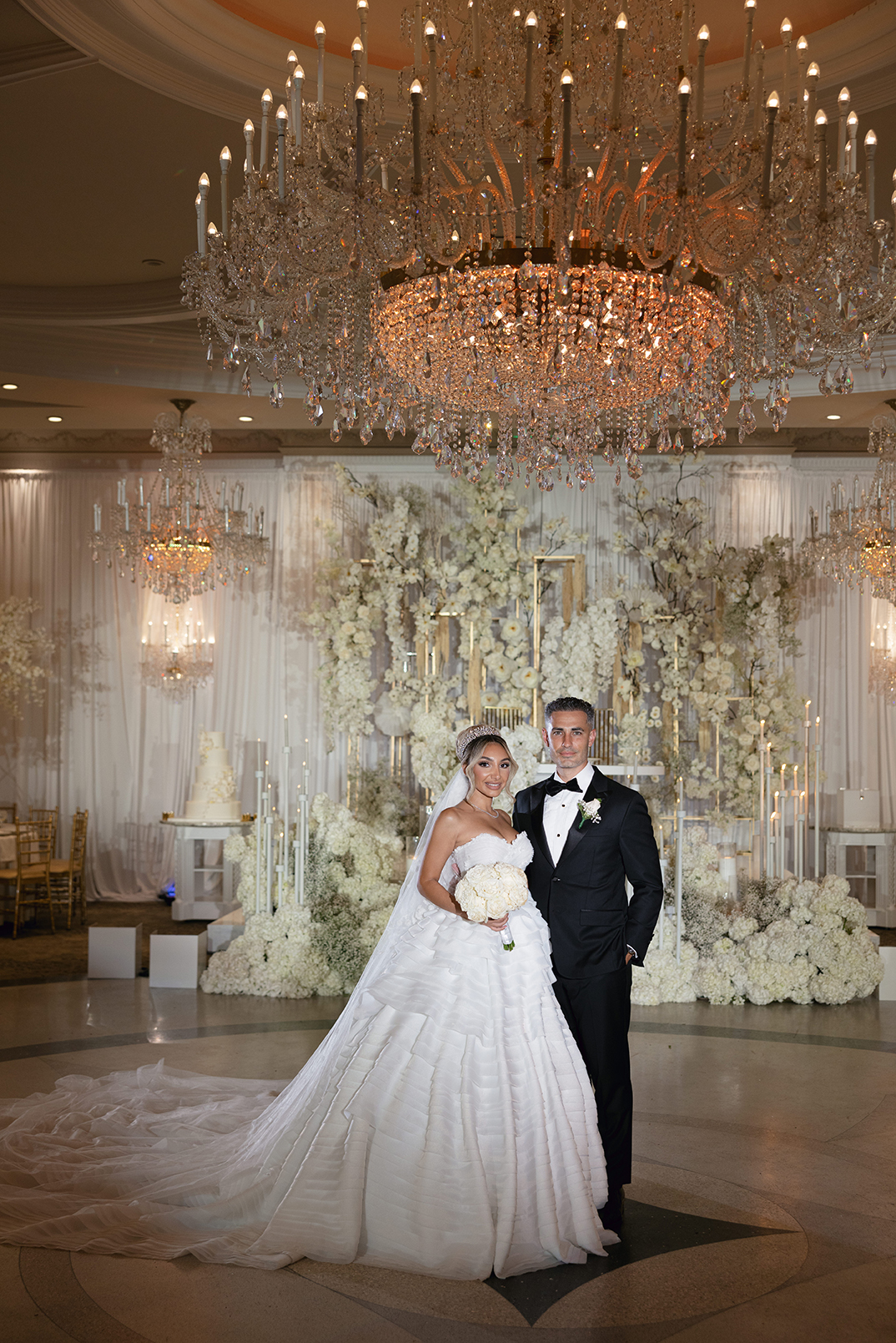 The couple also chose our house-style draping to serve as a stunning backdrop for family portraits, creating the perfect frame for their cherished memories. The reception featured a white acrylic stage with our elegant Graceland sweetheart table, accompanied by a soft white drapery behind the stage, setting a serene and intimate atmosphere for the newlyweds. To elevate the overall ambiance, Melissa and Carmine opted for our premium lighting rentals, which illuminated the stage with a soft, romantic glow, while also pin-spotlighting the masterfully designed centerpieces created by Sarcon Flower Couture, adding depth and radiance to every floral arrangement. The result was a wedding that exuded timeless elegance, where every detail—down to the lighting—came together to highlight the couple’s love in the most beautiful way.