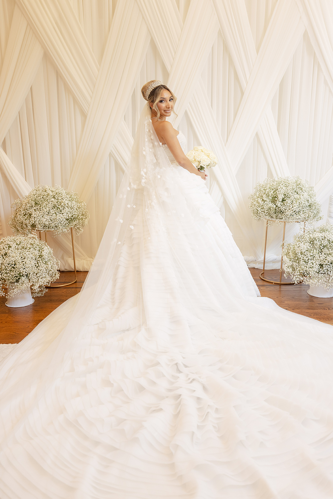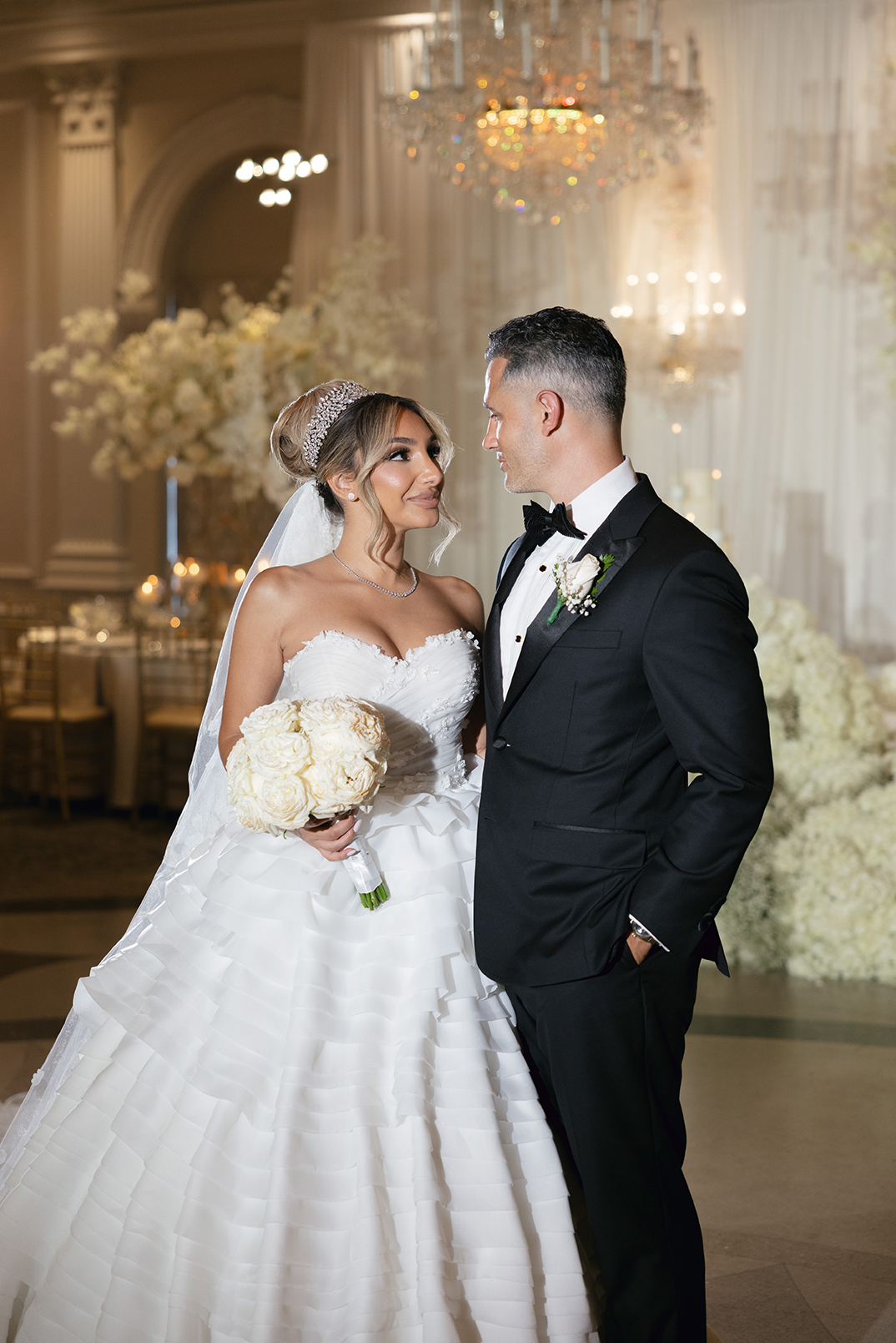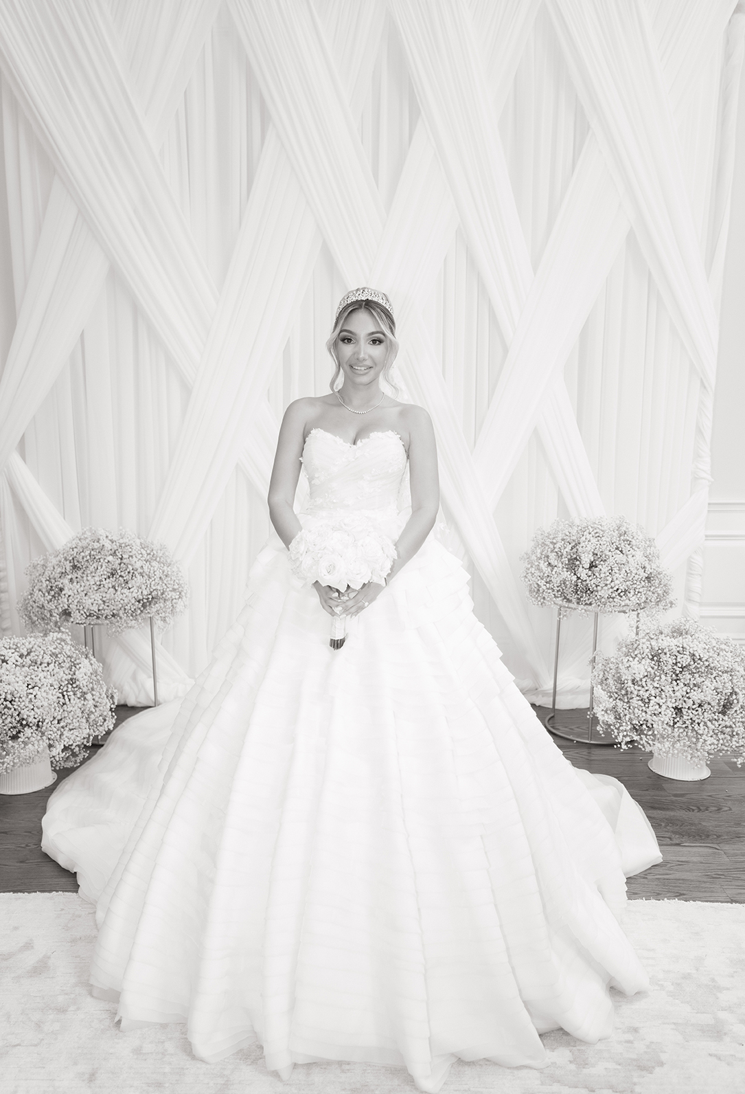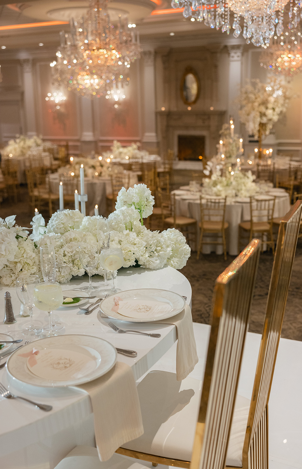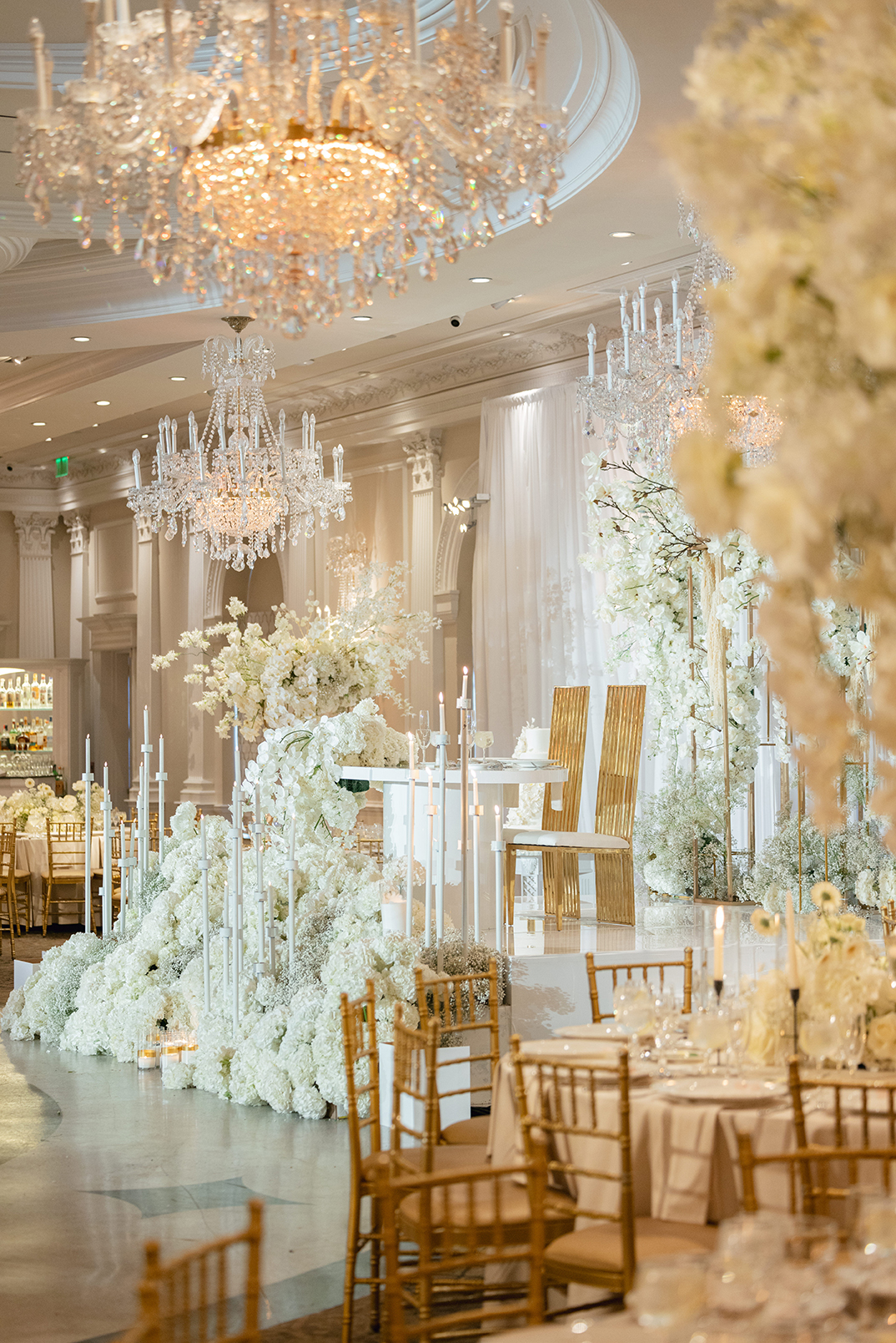 The couple also chose our house-style draping to serve as a stunning backdrop for family portraits, creating the perfect frame for their cherished memories. The reception featured a white acrylic stage with our elegant Graceland sweetheart table, accompanied by a soft white drapery behind the stage, setting a serene and intimate atmosphere for the newlyweds. To elevate the overall ambiance, Melissa and Carmine opted for our premium lighting rentals, which illuminated the stage with a soft, romantic glow, while also pin-spotlighting the masterfully designed centerpieces created by Sarcon Flower Couture, adding depth and radiance to every floral arrangement. The result was a wedding that exuded timeless elegance, where every detail—down to the lighting—came together to highlight the couple’s love in the most beautiful way.