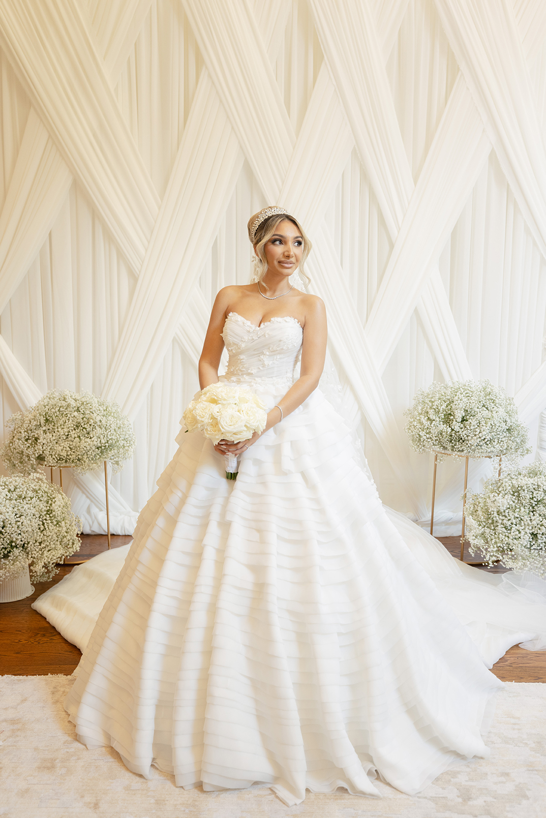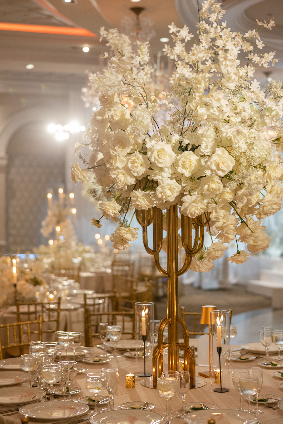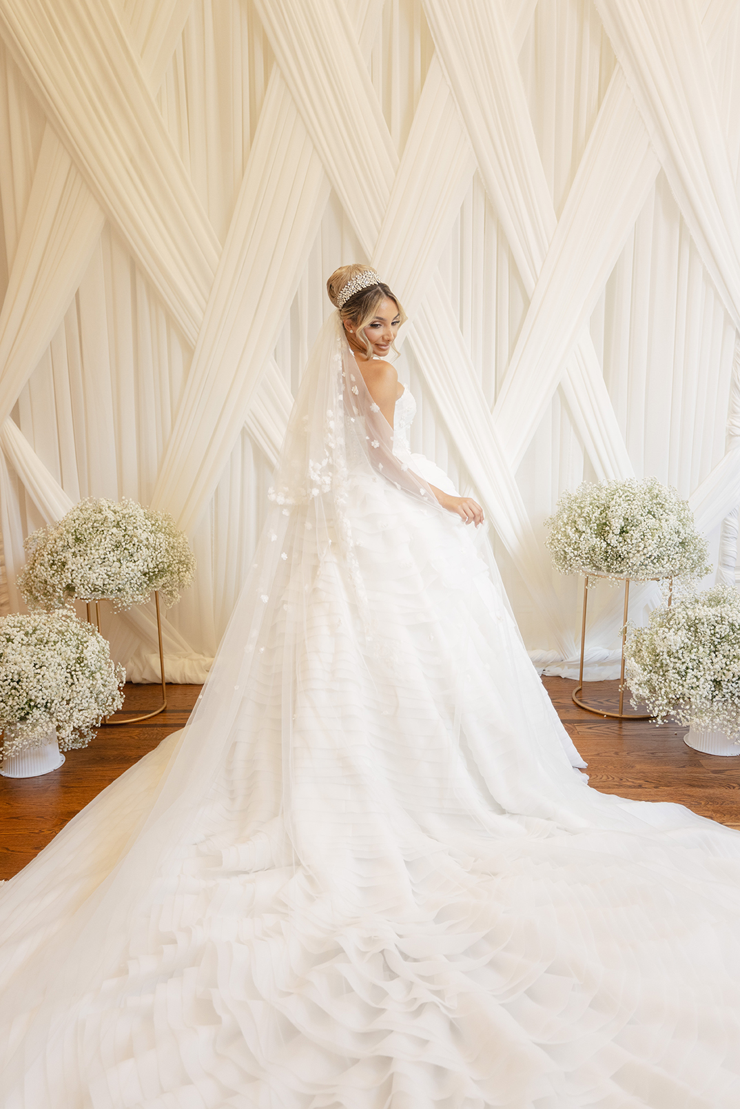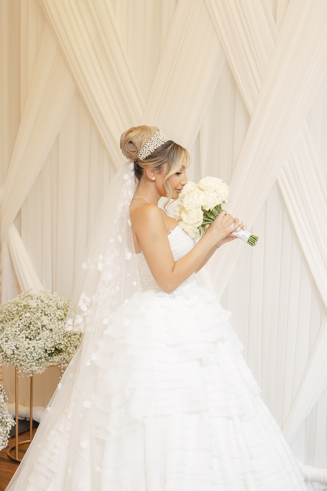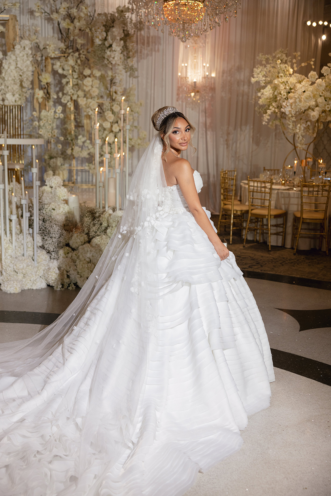 The couple also chose our house-style draping to serve as a stunning backdrop for family portraits, creating the perfect frame for their cherished memories. The reception featured a white acrylic stage with our elegant Graceland sweetheart table, accompanied by a soft white drapery behind the stage, setting a serene and intimate atmosphere for the newlyweds. To elevate the overall ambiance, Melissa and Carmine opted for our premium lighting rentals, which illuminated the stage with a soft, romantic glow, while also pin-spotlighting the masterfully designed centerpieces created by Sarcon Flower Couture, adding depth and radiance to every floral arrangement. The result was a wedding that exuded timeless elegance, where every detail—down to the lighting—came together to highlight the couple’s love in the most beautiful way.