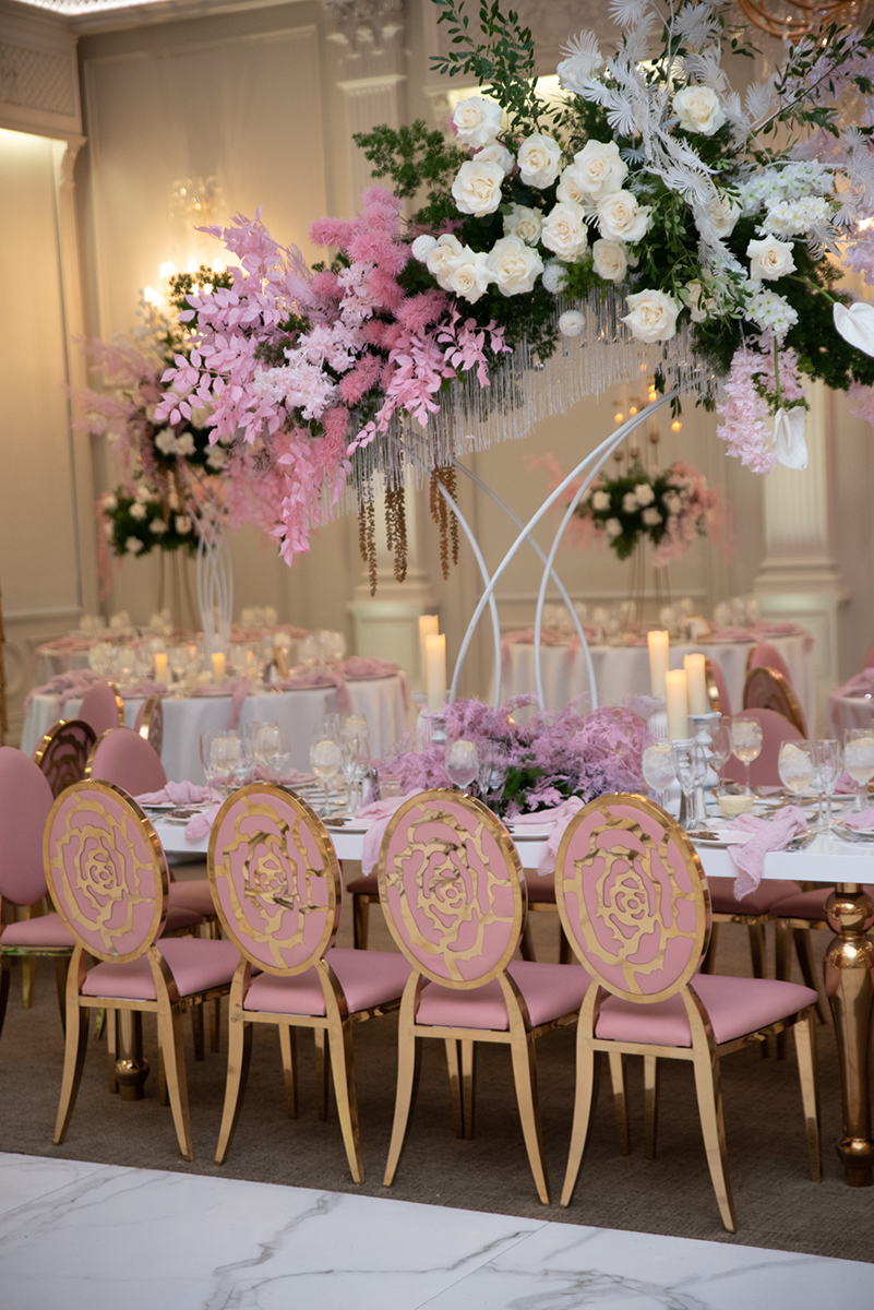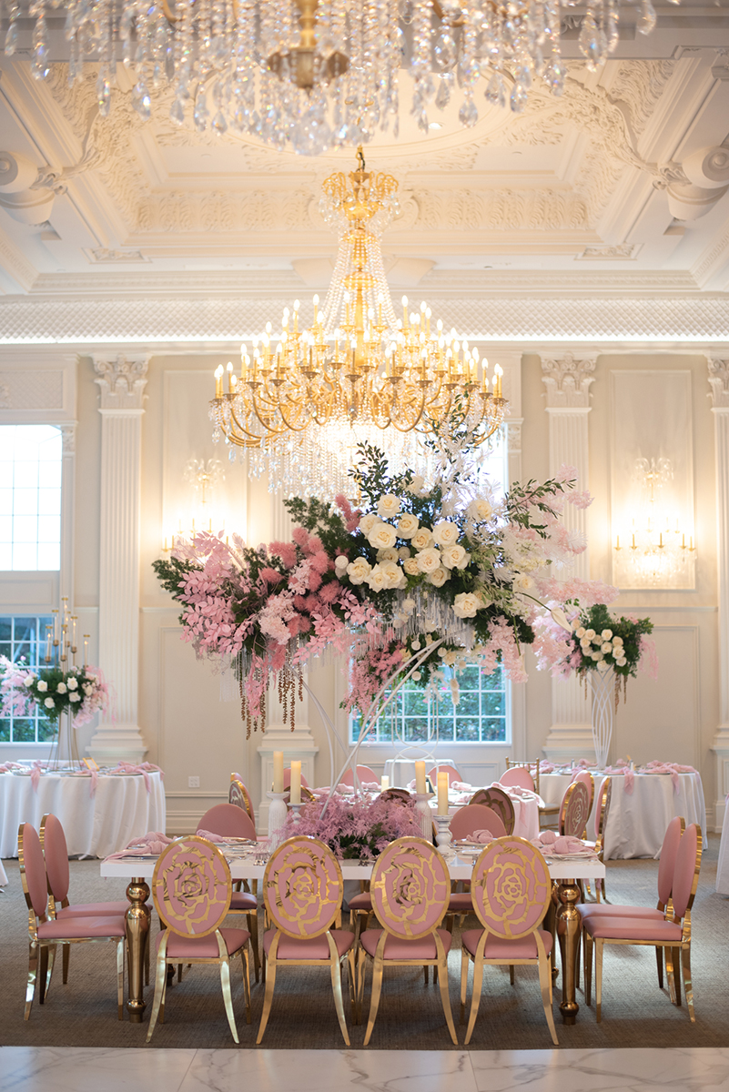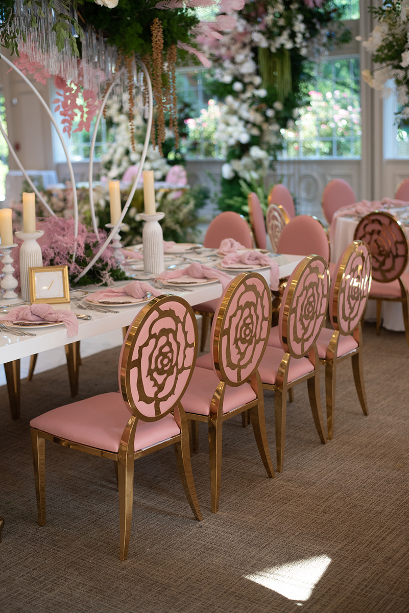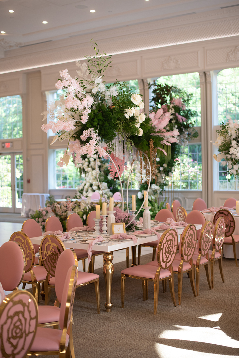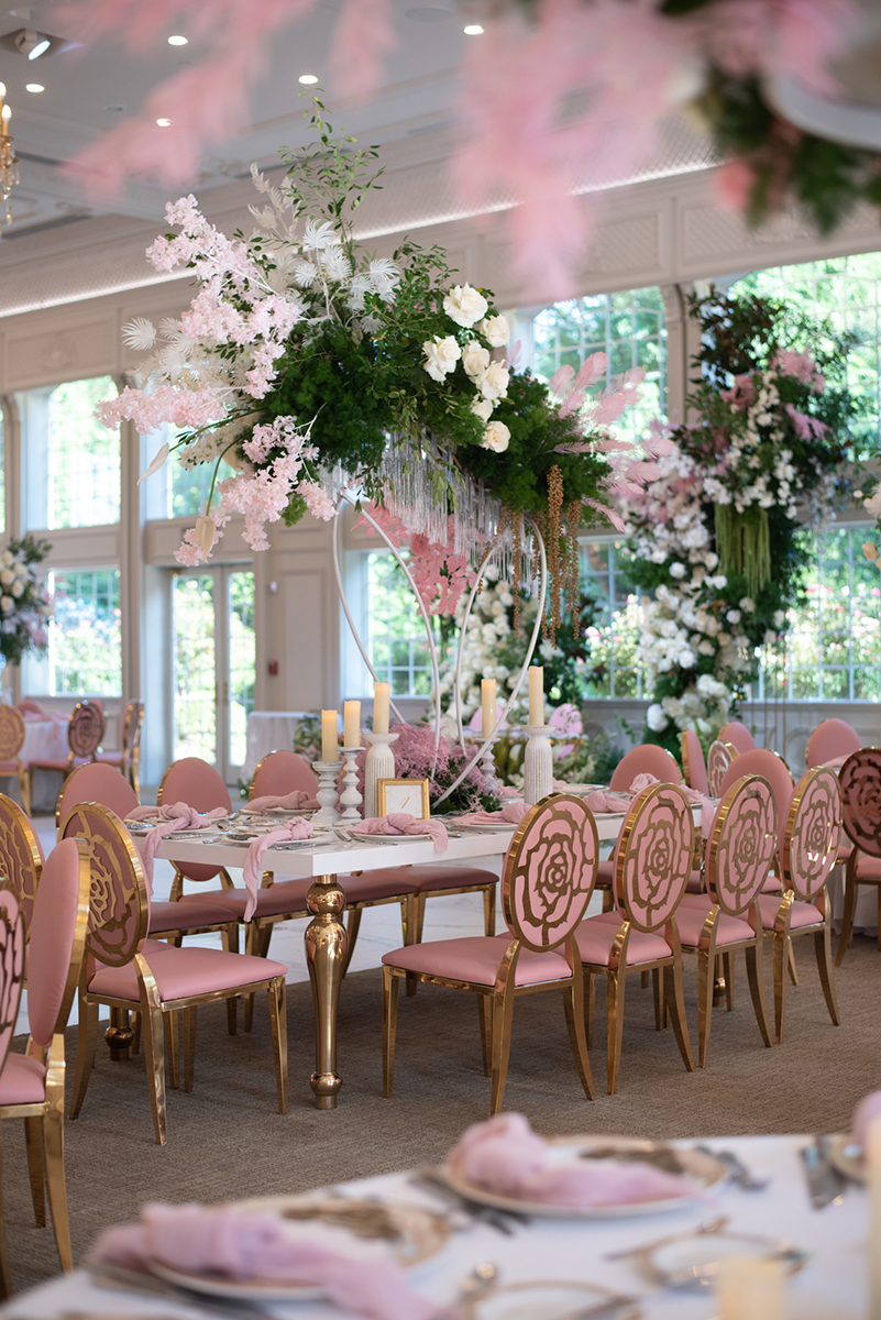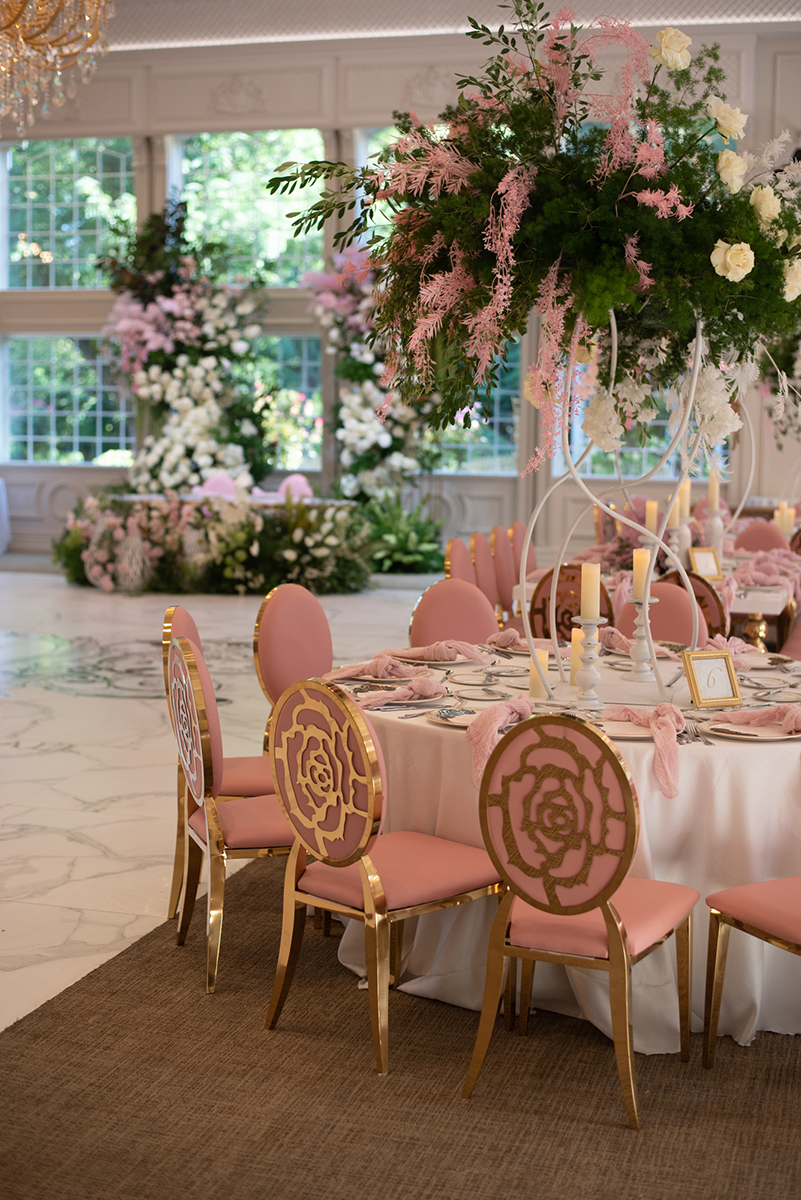Nanjika and Kevin’s wedding at the Florentine Gardens in River Vale, NJ was truly extravagant. The florals designed by Sarcon Flower Couture were absolutely stunning, and our Rosabelle – Blush Pink & Gold Chairs added a touch of elegance to the event. The Athena Estate tables were also a beautiful addition, providing ample space for guests to enjoy the festivities. And of course, the Khaleesi Sweetheart table was the perfect way to showcase the happy couple. Overall, it was a truly magical day that will be remembered for years to come.