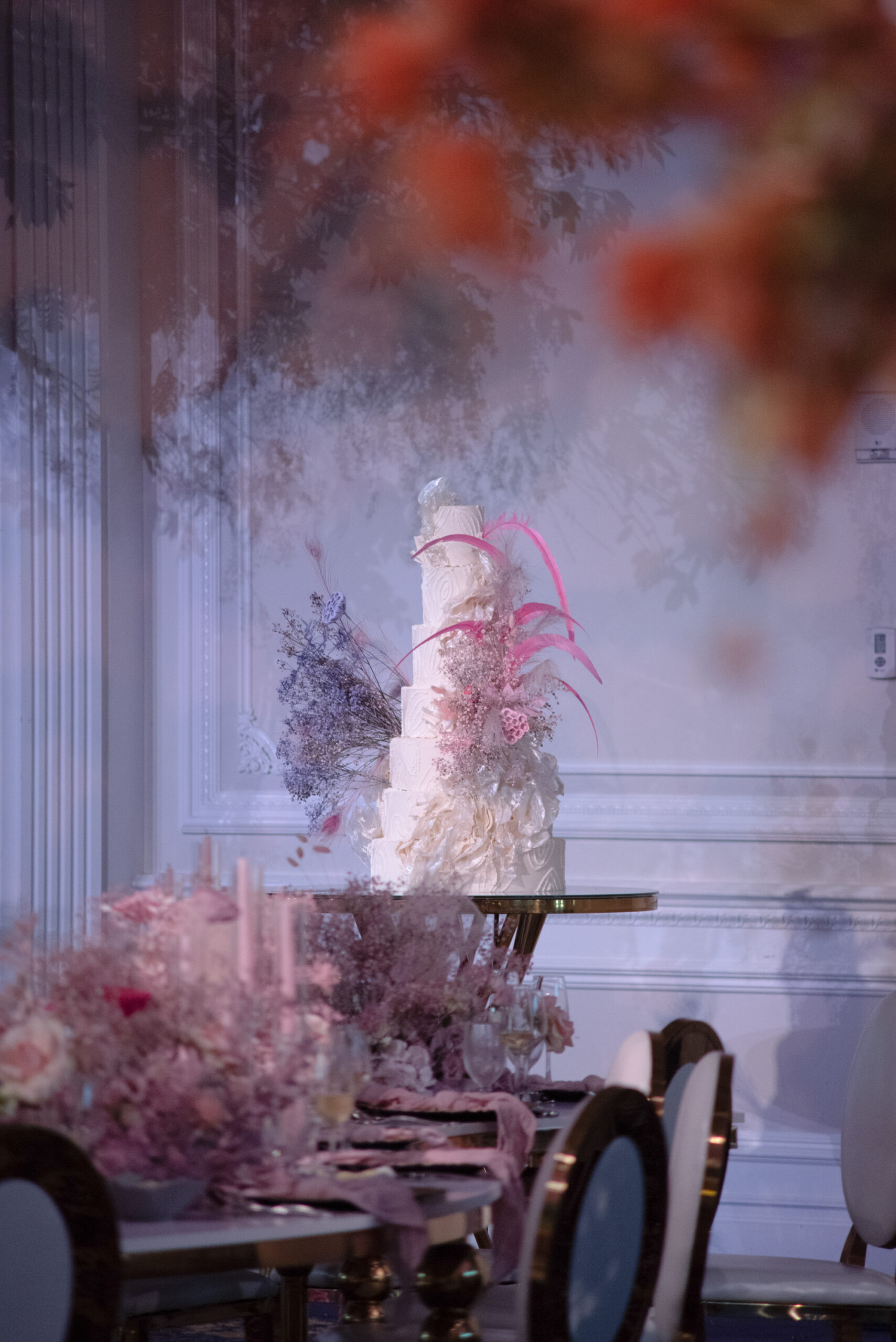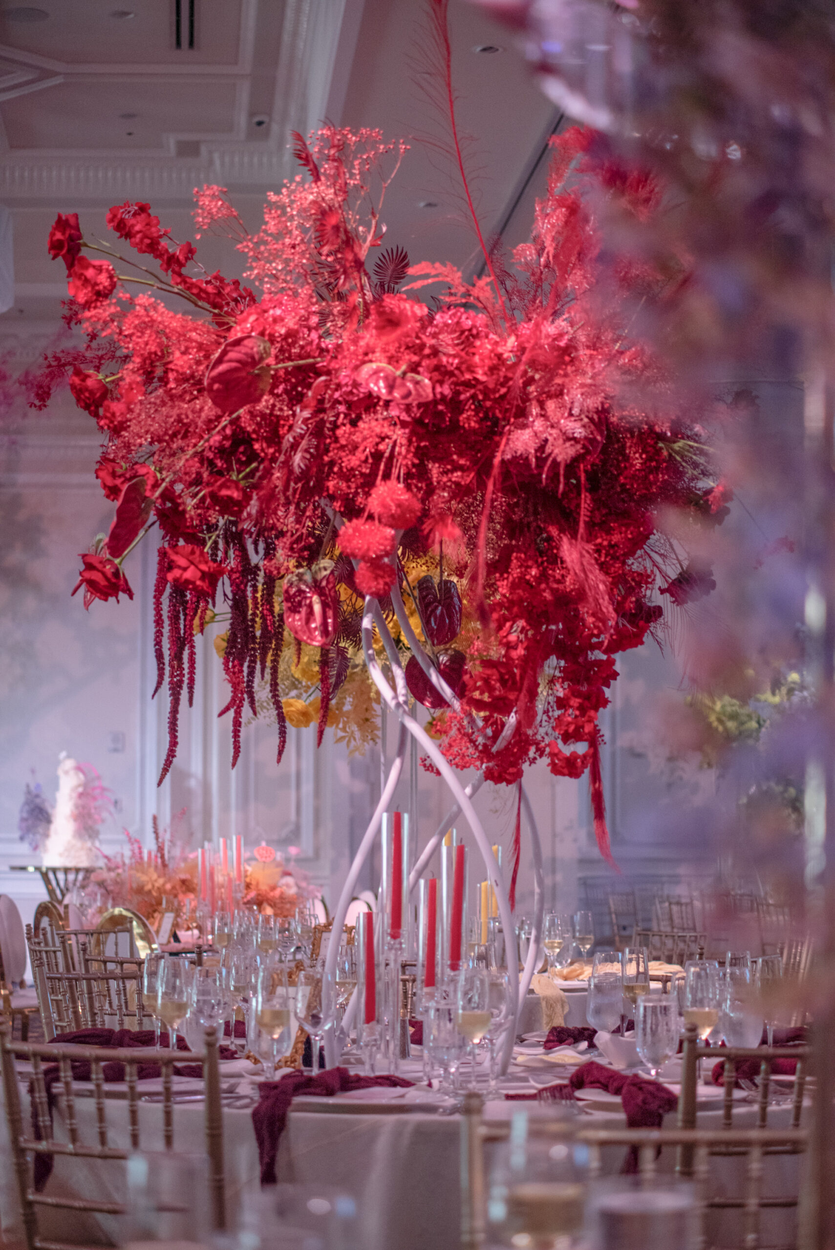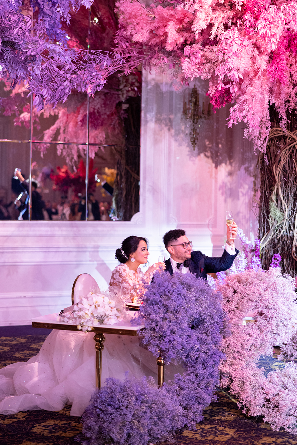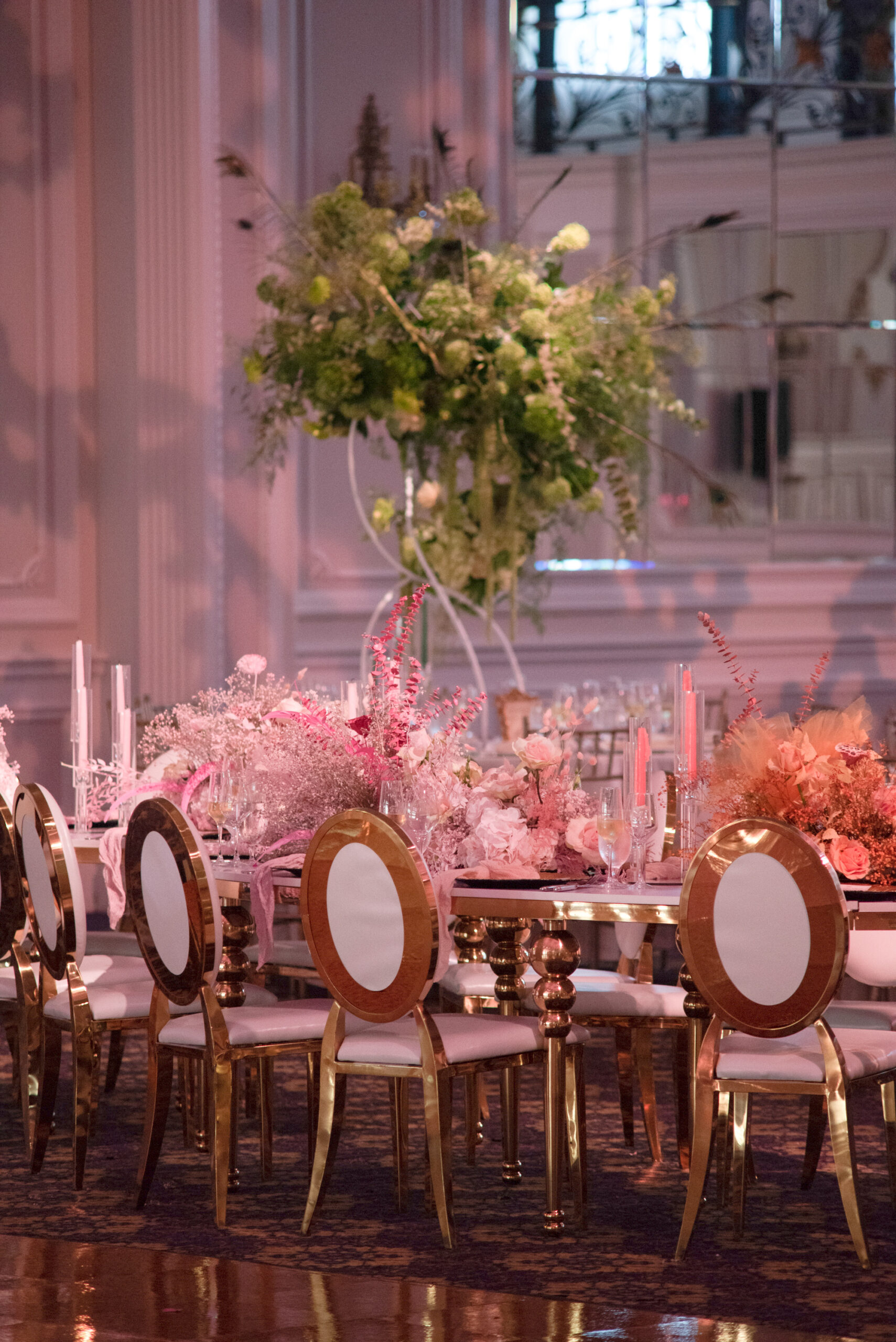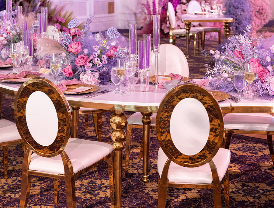 Nardine Marie & Mina’s wedding at The Legacy Castle in Pompton Plains, NJ was an absolute dream come true! The highlight of the reception was undoubtedly displayed with our stunning His and Her’s Khaleesi White & Gold sweetheart table, adorned with the elegant Giovanna White & Gold Chairs. It provided the perfect setting for the newlyweds to share intimate moments together. The Kleopatra Gold & White tables, arranged in a serpentine style, created a sense of grandeur and sophistication for the families of the bride and groom. These tables were beautifully displayed on both sides of the stage, surrounded by our exquisite Xiomara White & Gold chairs. And let’s not forget about the show-stopping Valentina Decorative Cake table, which showcased their magnificent wedding cake. It was an honor to be a part of this extraordinary Colorful Wonderland wedding designed by Sarcon Flower Couture and witness the love and joy that filled the Legacy Castle that day.