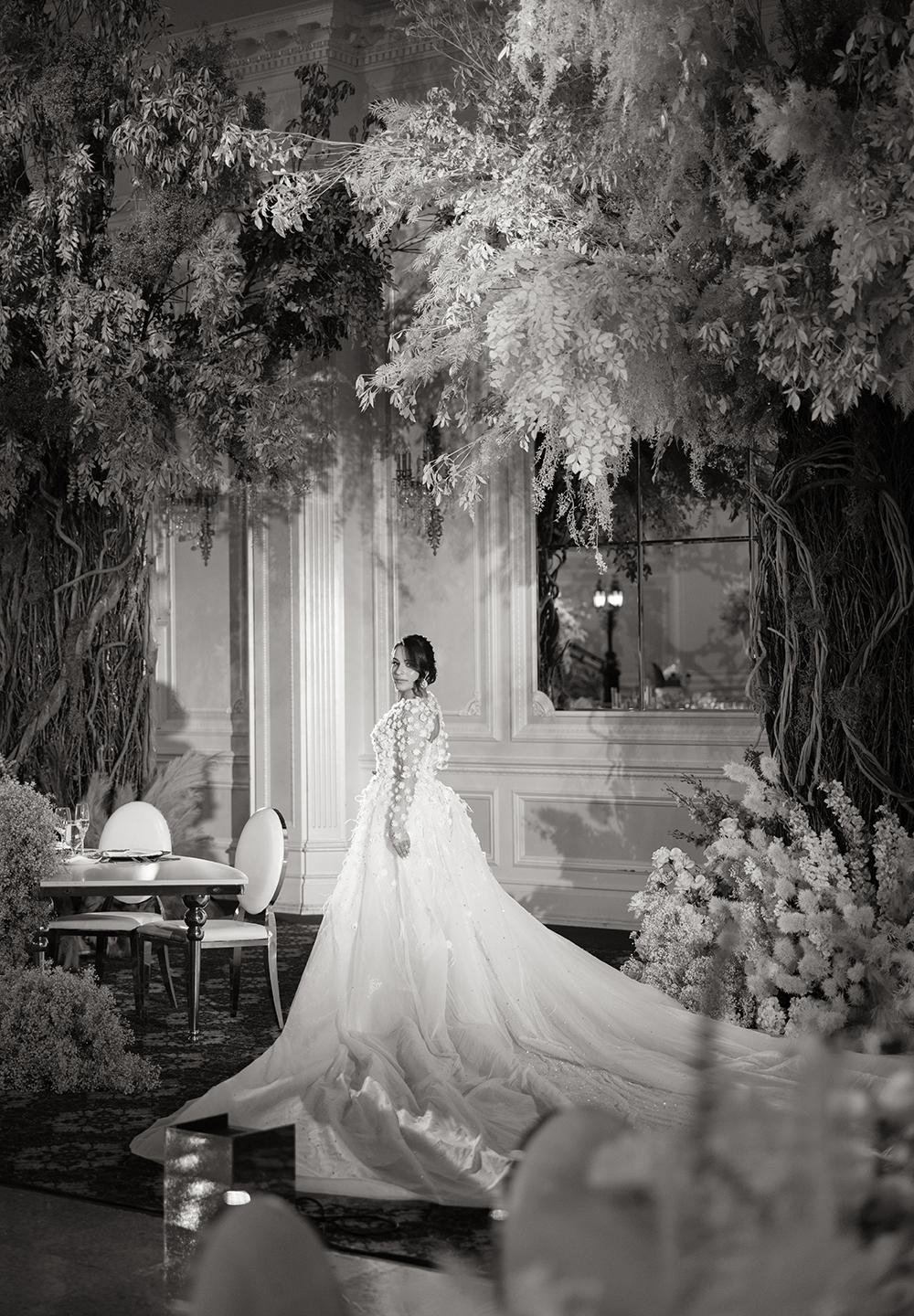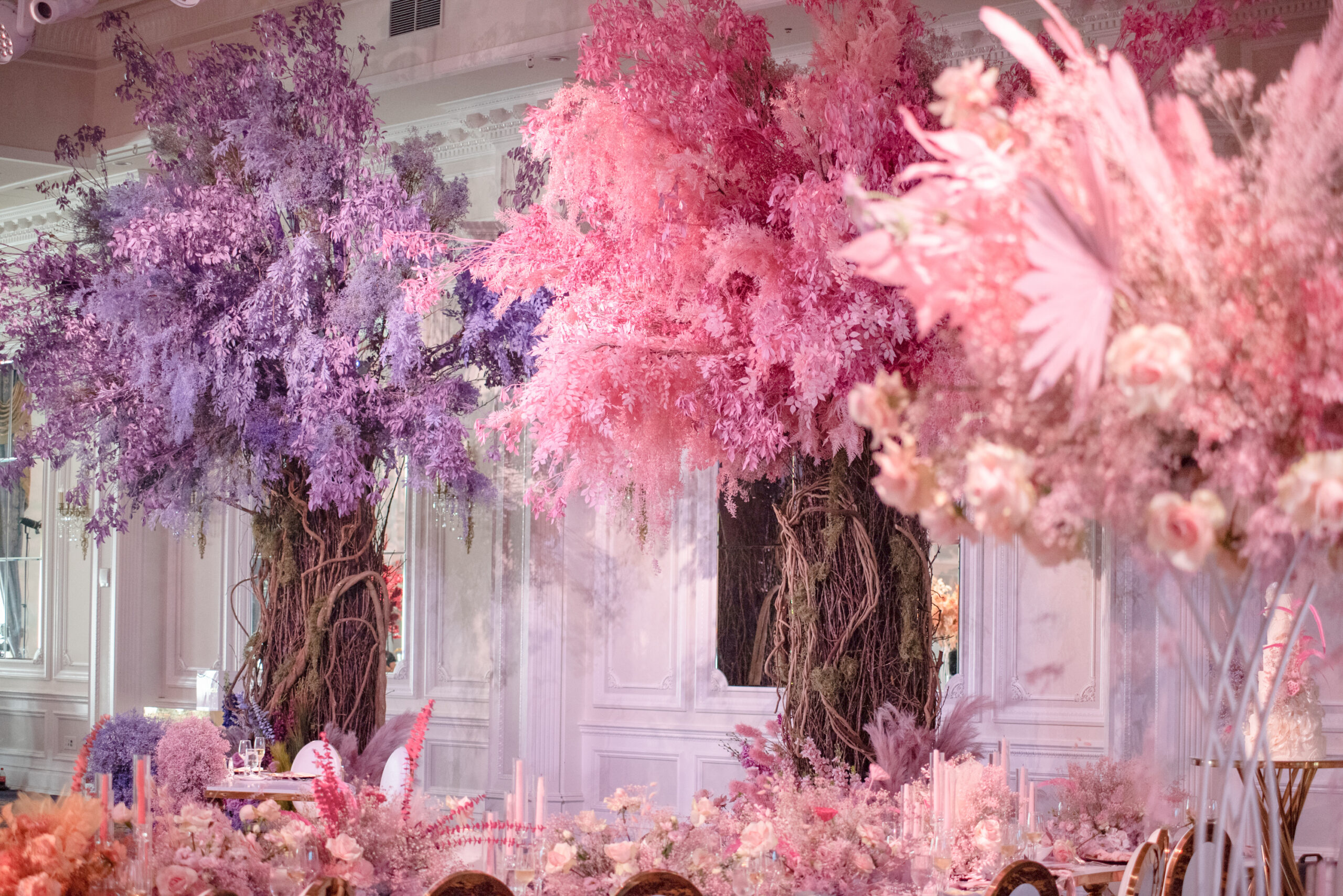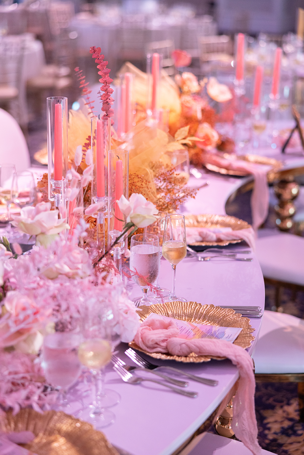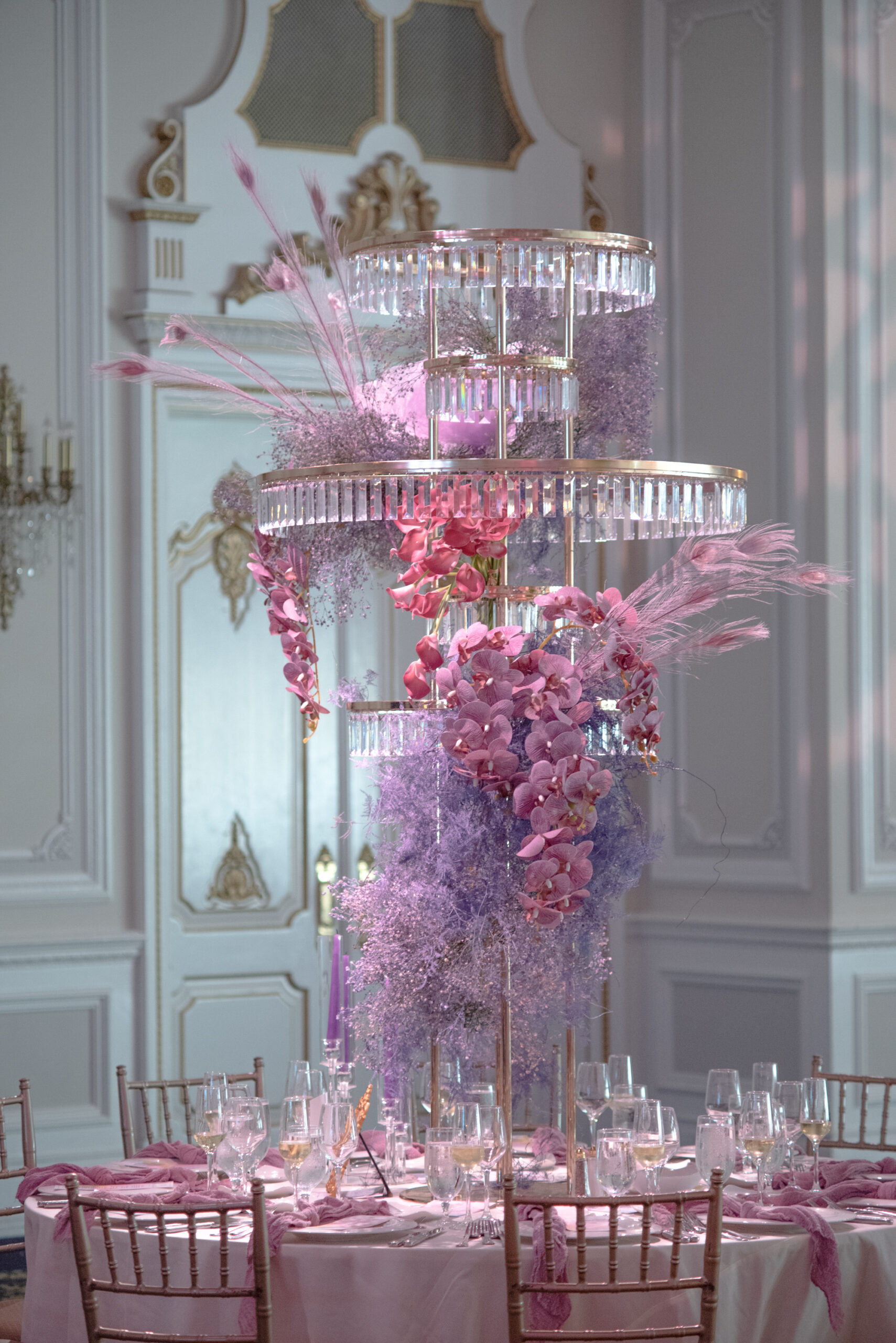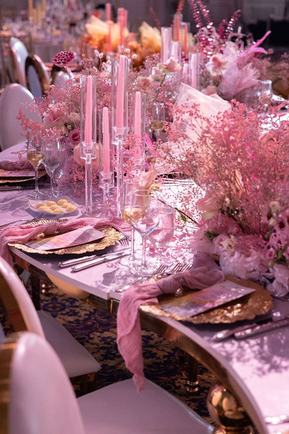Nardine Marie & Mina’s wedding at The Legacy Castle in Pompton Plains, NJ was an absolute dream come true! The highlight of the reception was undoubtedly displayed with our stunning His and Her’s Khaleesi White & Gold sweetheart table, adorned with the elegant Giovanna White & Gold Chairs. It provided the perfect setting for the newlyweds to share intimate moments together. The Kleopatra Gold & White tables, arranged in a serpentine style, created a sense of grandeur and sophistication for the families of the bride and groom. These tables were beautifully displayed on both sides of the stage, surrounded by our exquisite Xiomara White & Gold chairs. And let’s not forget about the show-stopping Valentina Decorative Cake table, which showcased their magnificent wedding cake. It was an honor to be a part of this extraordinary Colorful Wonderland wedding designed by Sarcon Flower Couture and witness the love and joy that filled the Legacy Castle that day.