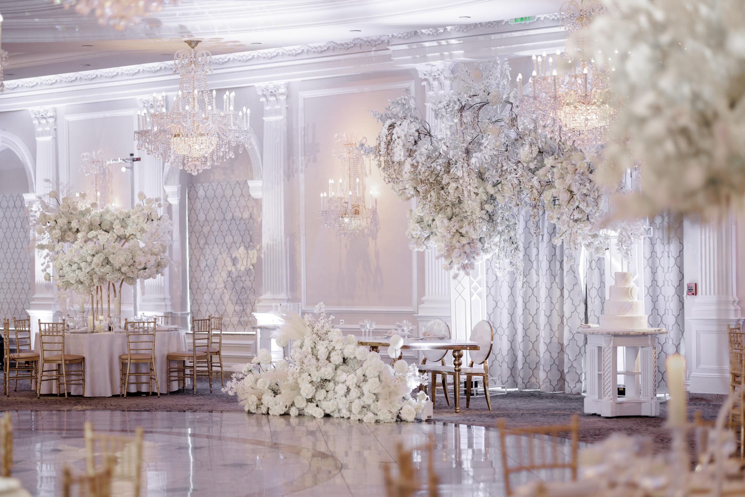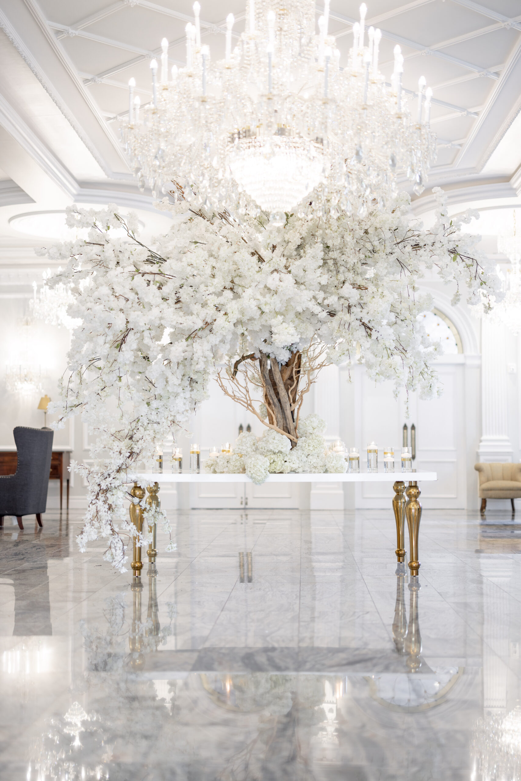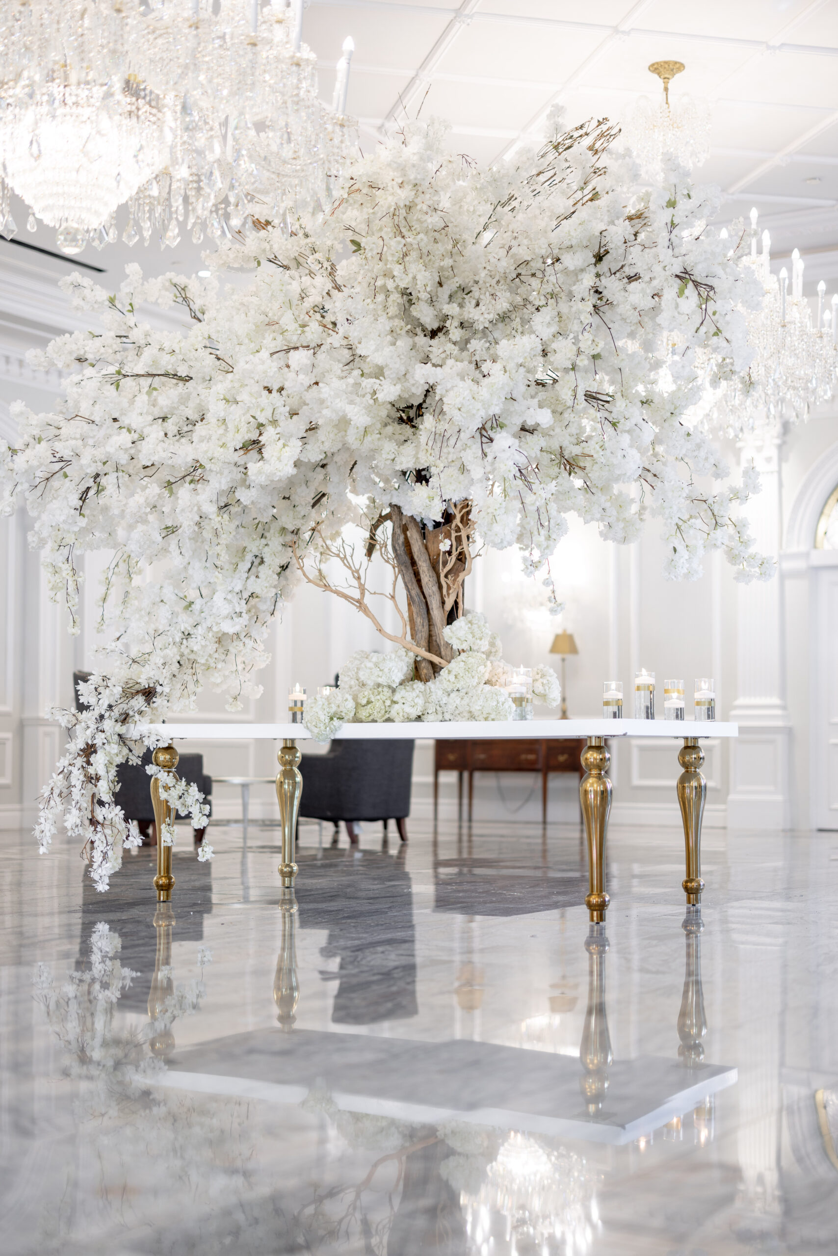 Class Event Rentals Wedding in white theme with Athena table adorned with white flowering tree