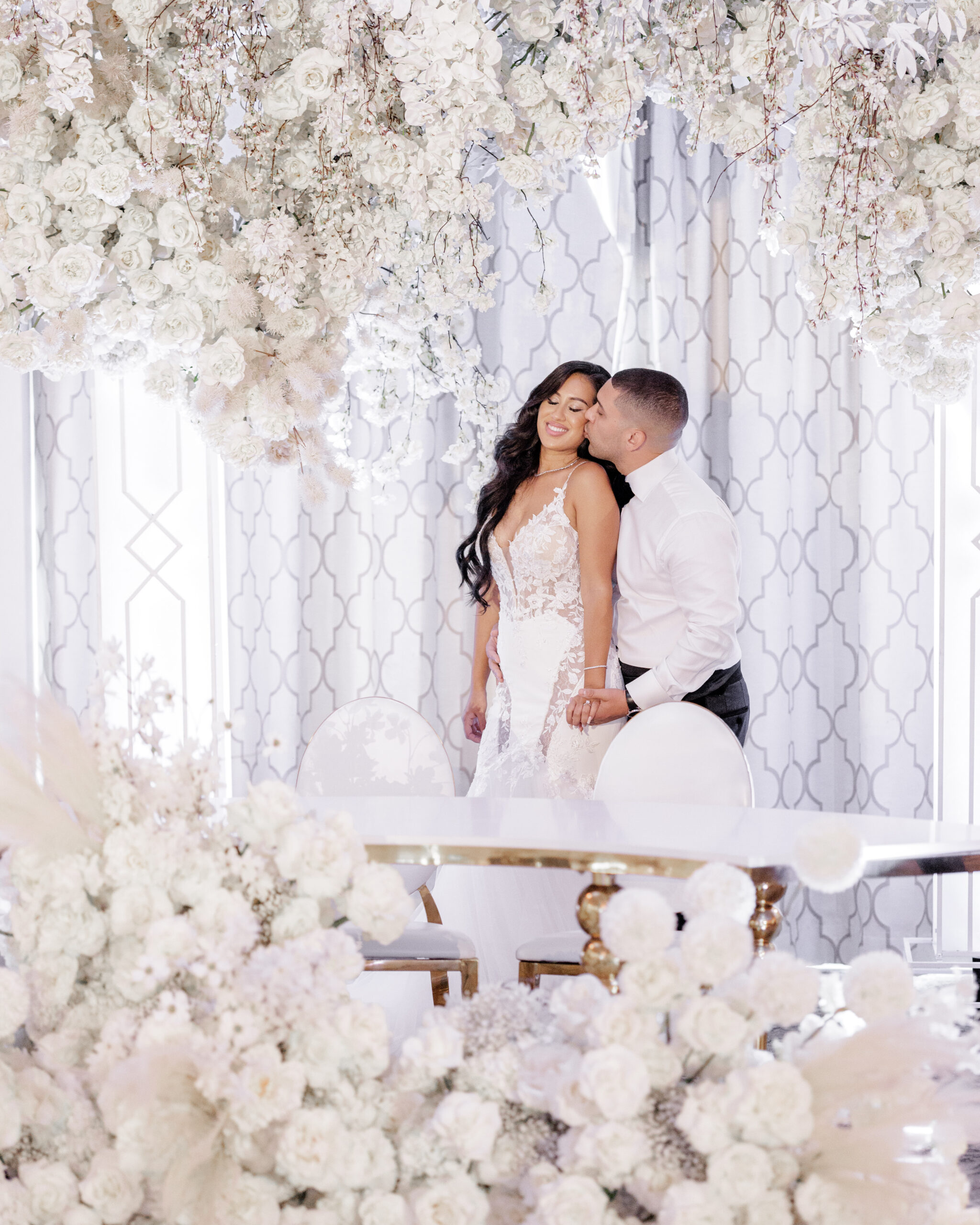 Class Event Rentals Wedding Couple with white table and chairs surrounded by white flowers