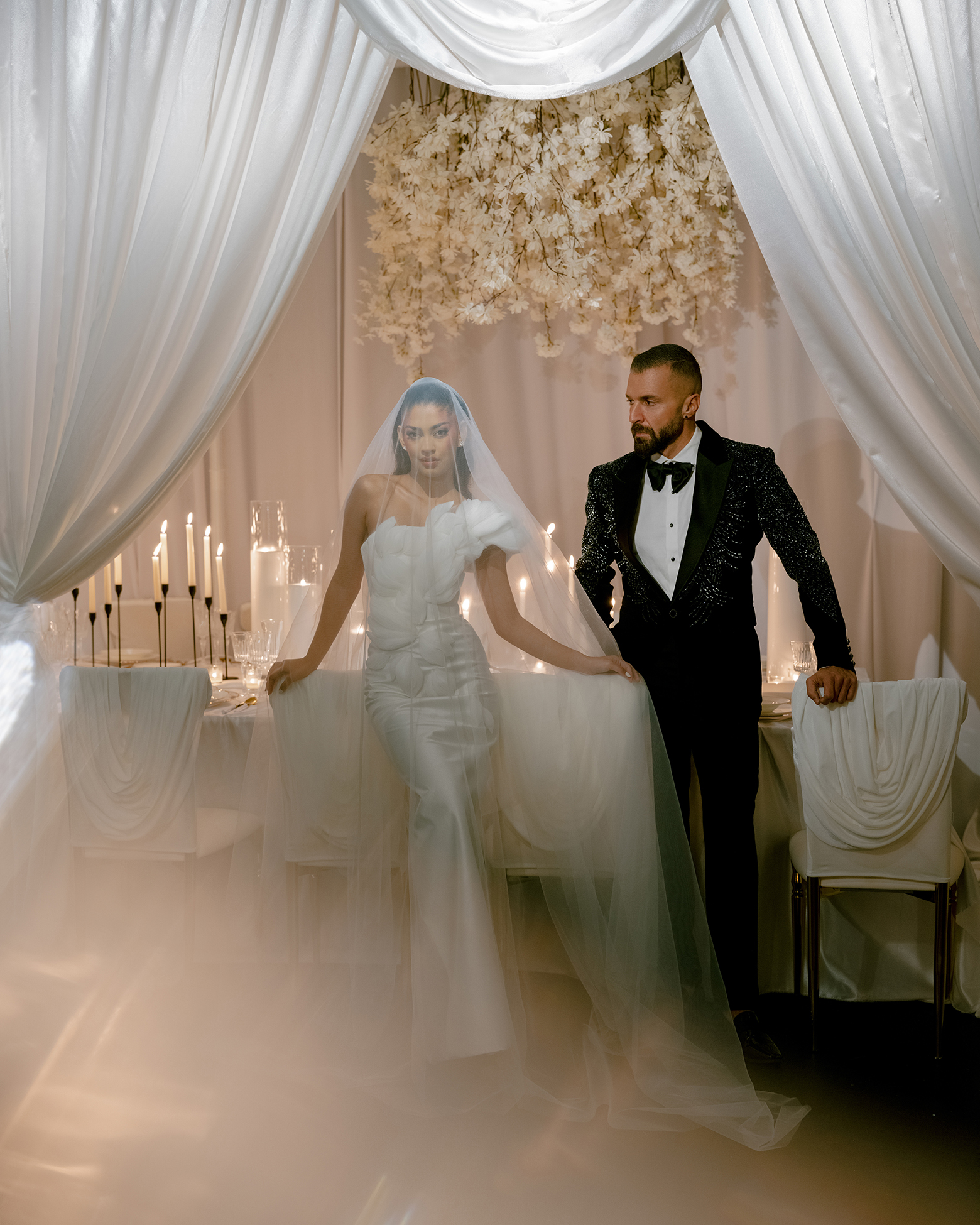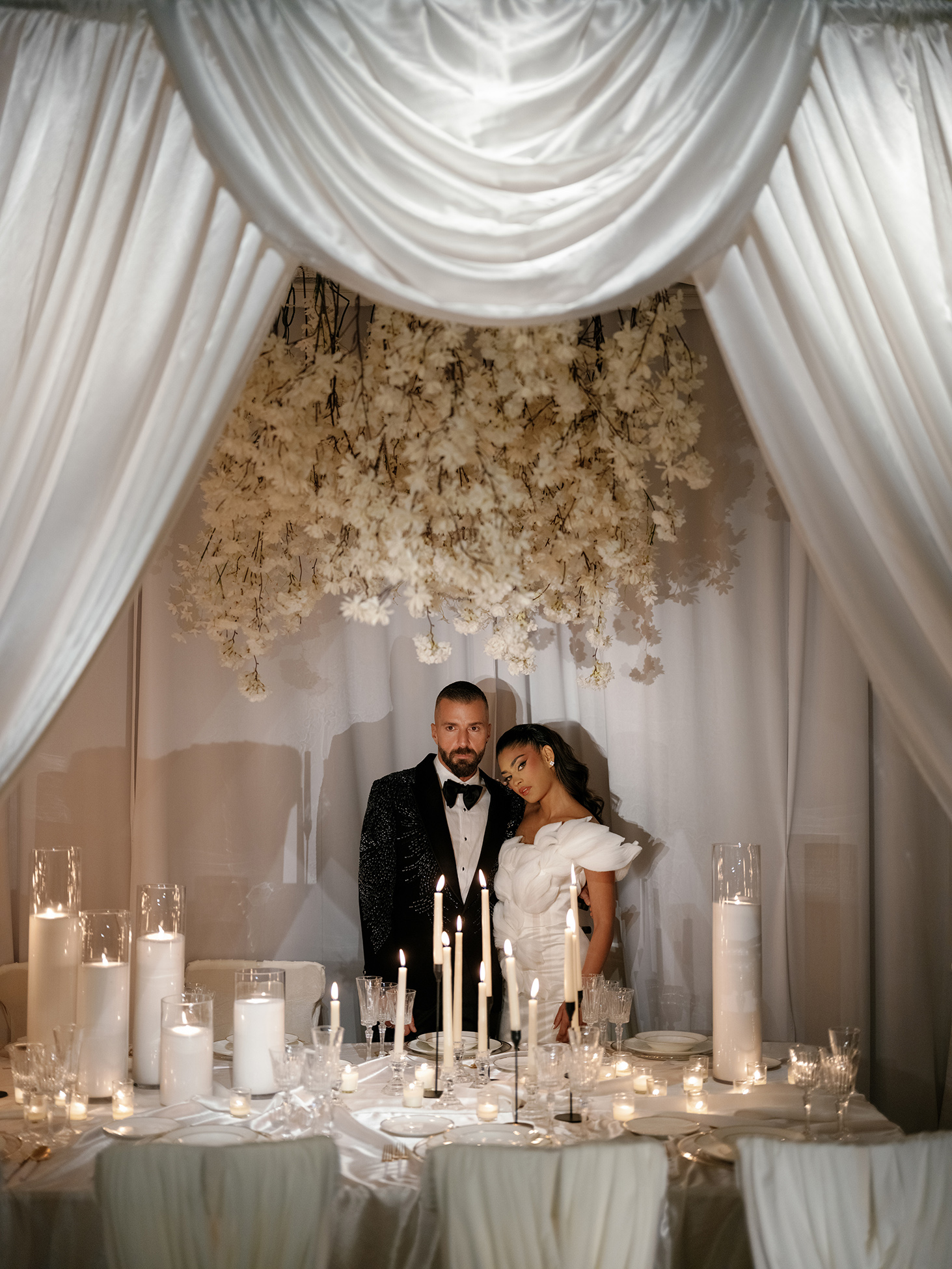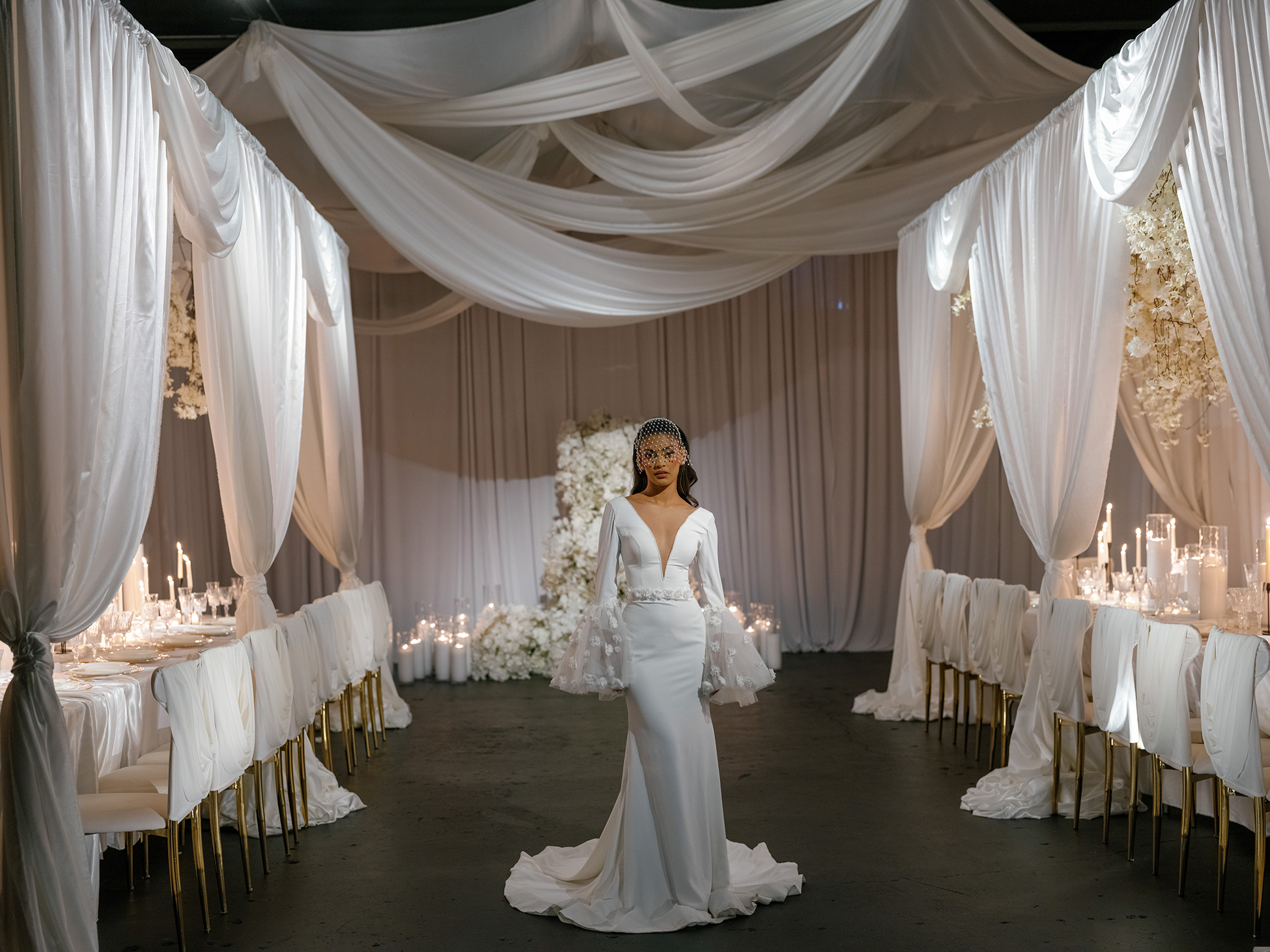 This stunning photoshoot collaboration showcases a beautifully curated white tunnel draping design, created to elevate any wedding setting. Partnering with Sarcon Flower Couture, MHM Videography, and Bond Photography Studio, the scene exudes elegance and sophistication. The flowing white fabric drapes, meticulously arranged in a tunnel-like style, create a grand display and an intimate yet luxurious ambiance for the family tables. These dramatic details emphasize the seamless blend of design and functionality, ideal for high-end events.