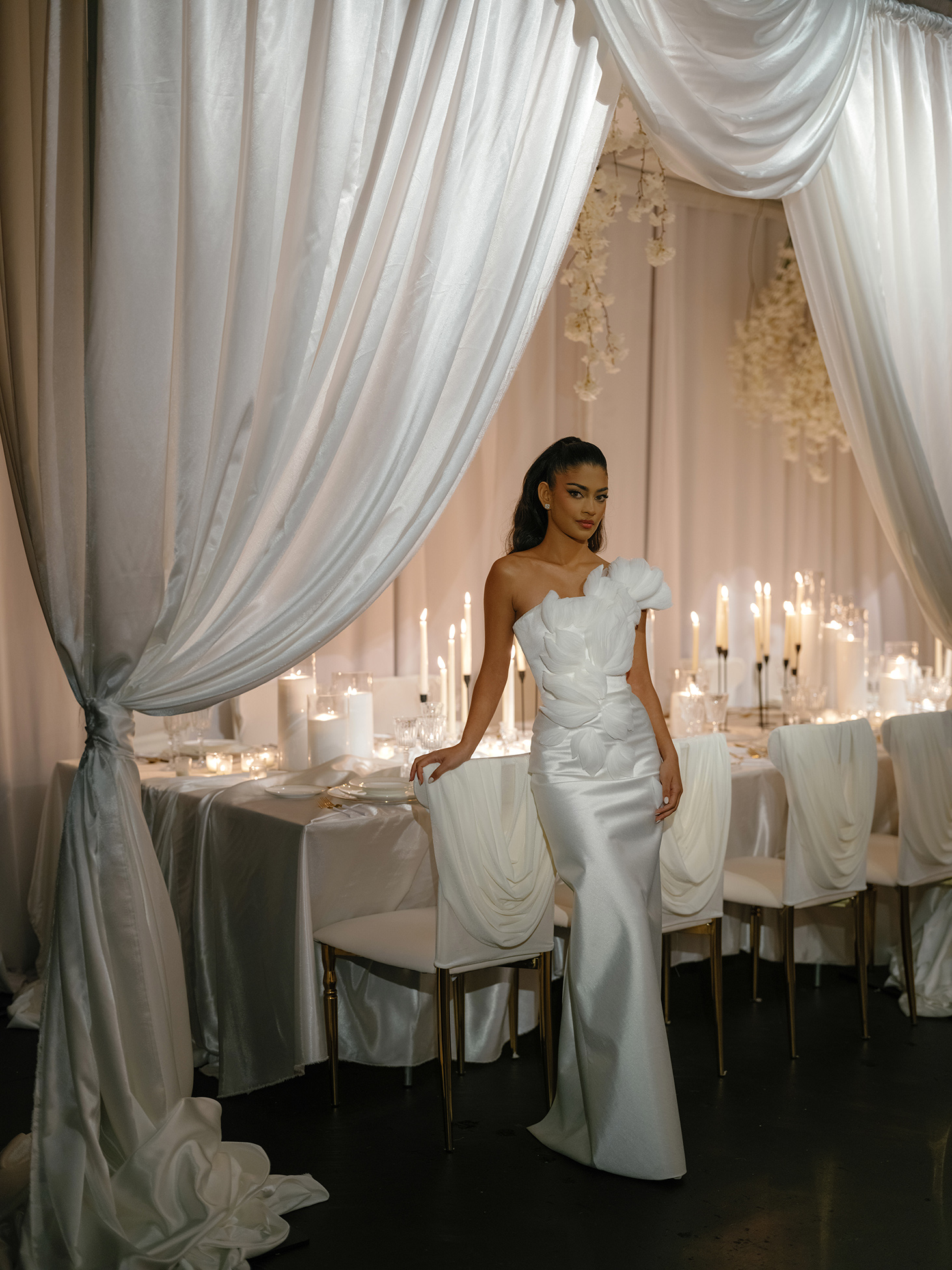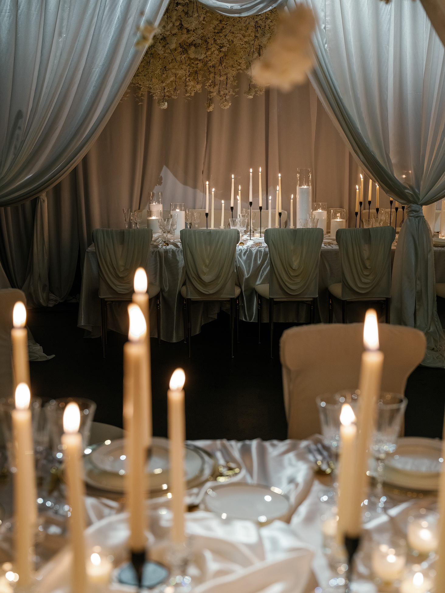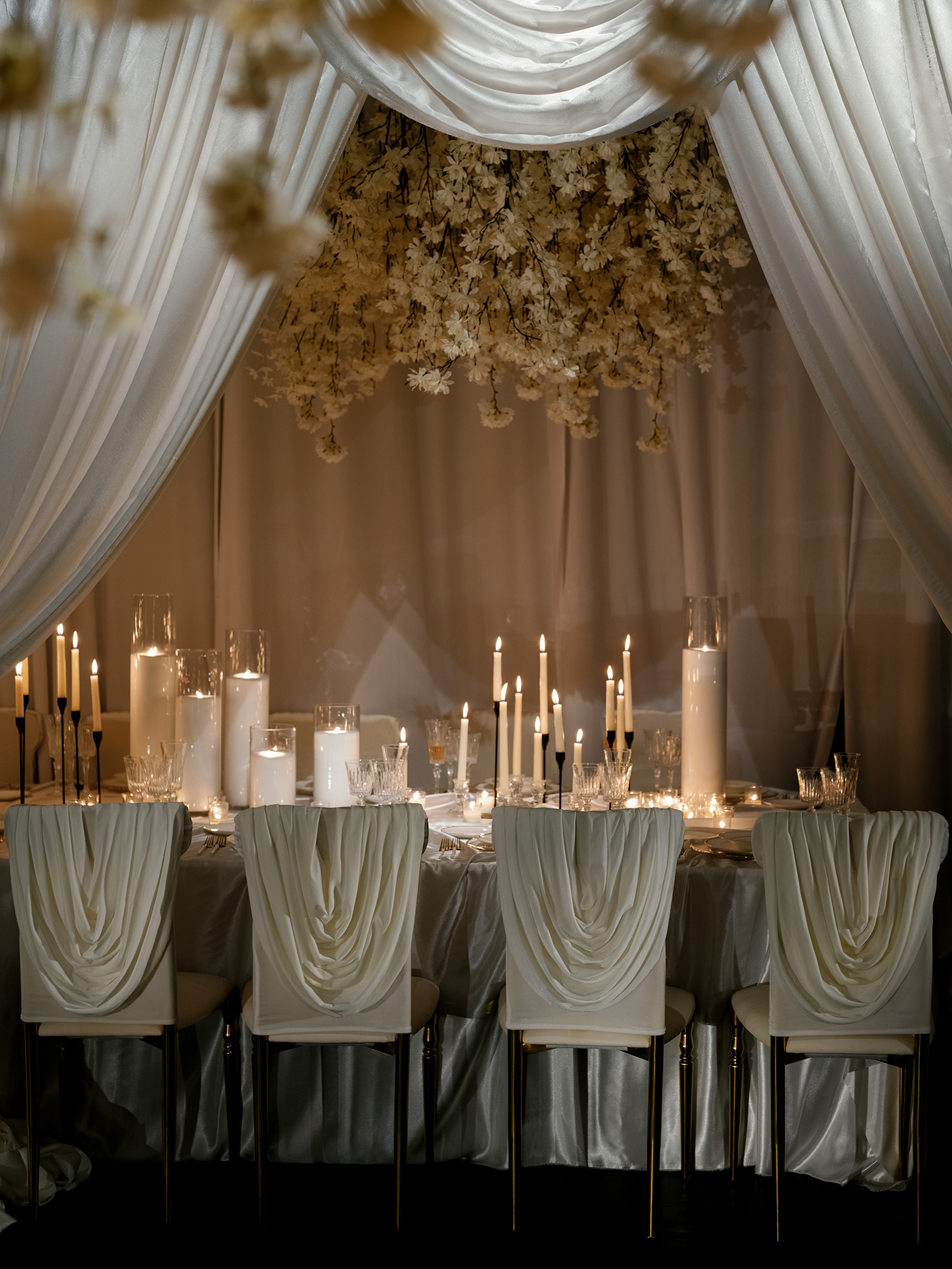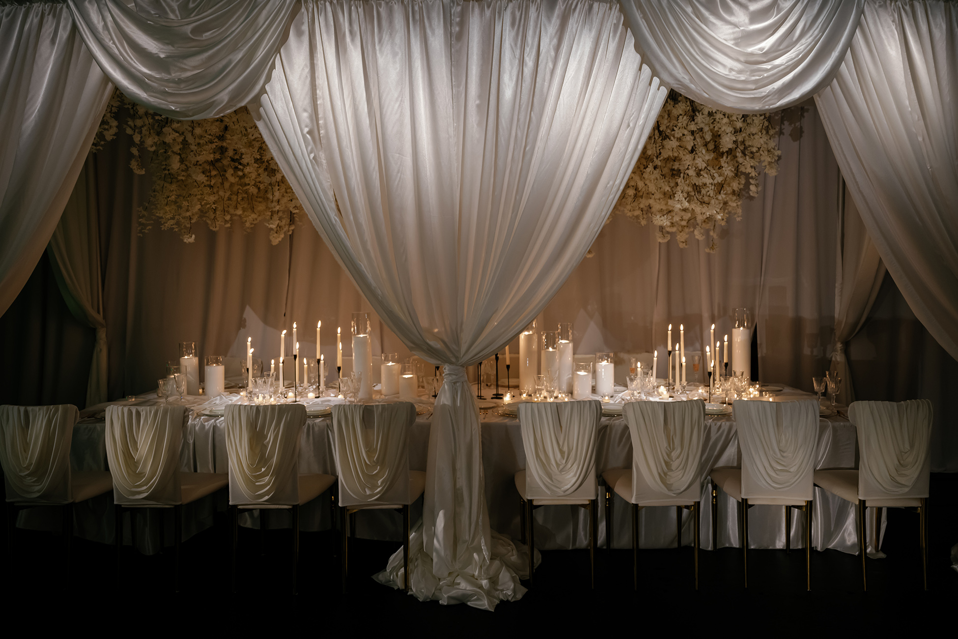 At the heart of the design is our estate-style family table, draped in matching white linens for a cohesive and refined look. The table is paired with our exclusive White Sway Collection chairs, known for their sleek, modern aesthetic and comfort. Carefully arranged table settings, adorned with flickering candlelight and exquisite floral arrangements by Sarcon Flower Couture, add layers of texture and charm to the presentation. The pin-spot lighting, thoughtfully positioned, enhances the visual impact by accentuating the fine details and setting the perfect mood.