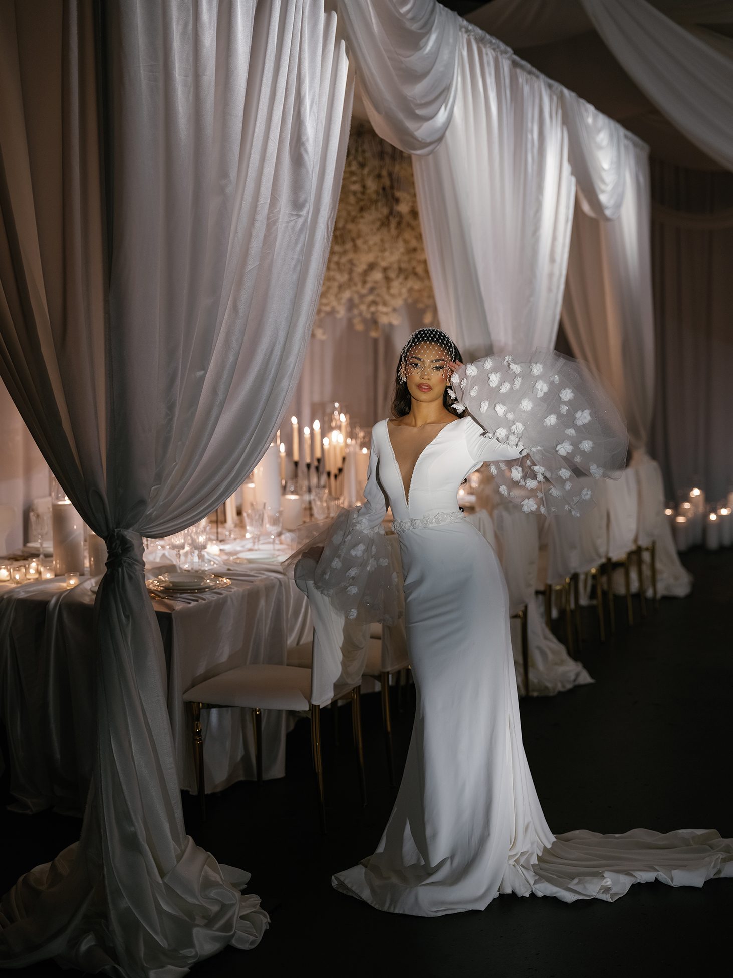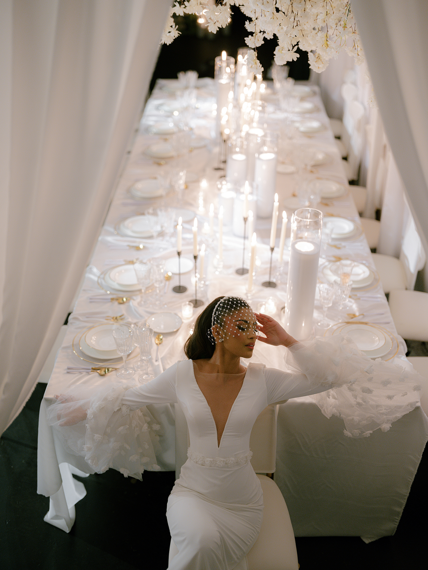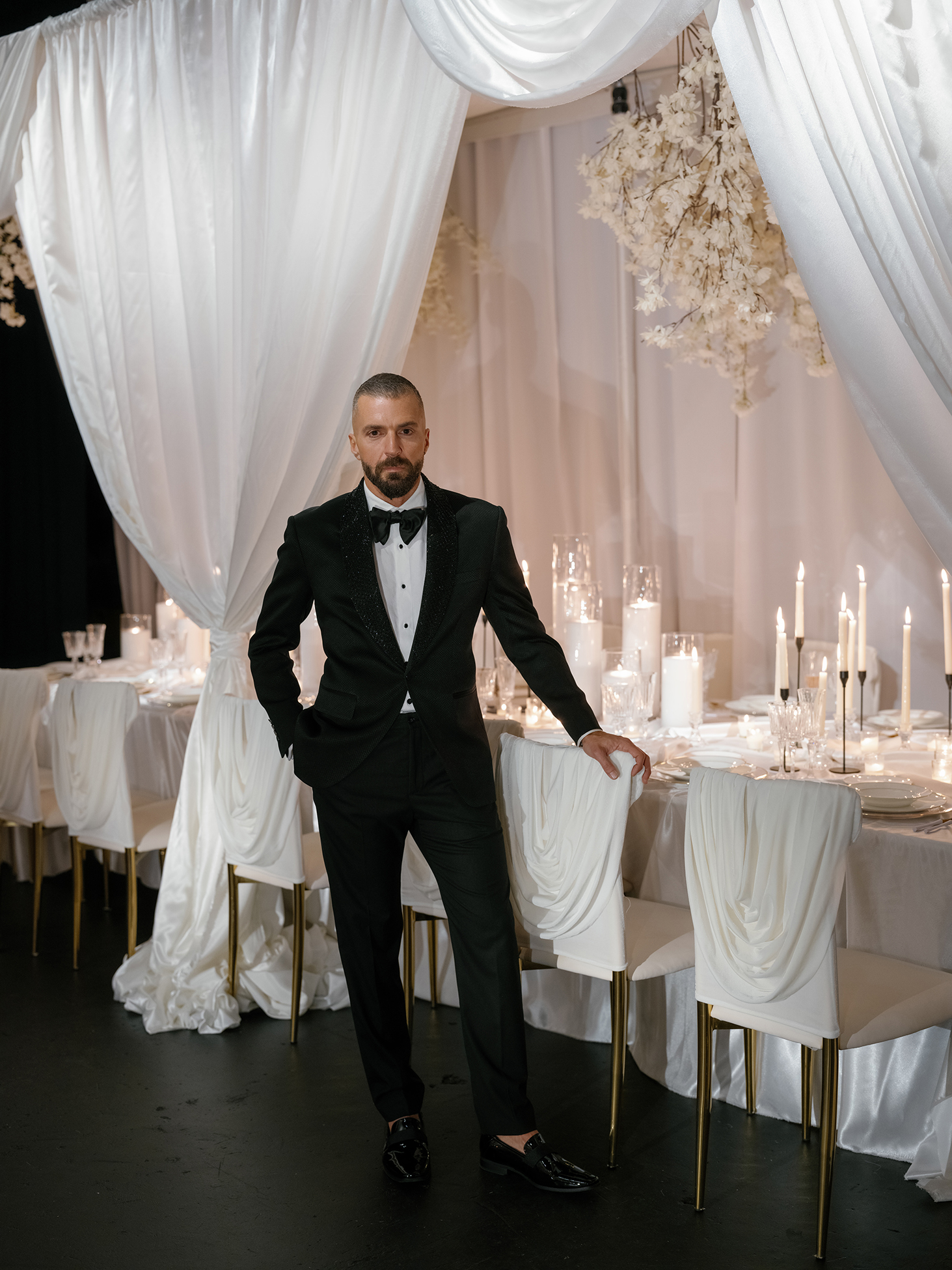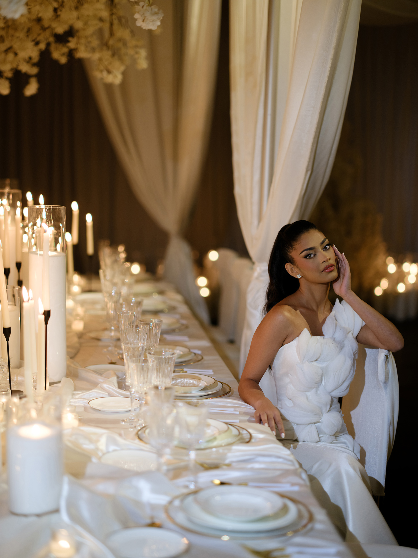 At the heart of the design is our estate-style family table, draped in matching white linens for a cohesive and refined look. The table is paired with our exclusive White Sway Collection chairs, known for their sleek, modern aesthetic and comfort. Carefully arranged table settings, adorned with flickering candlelight and exquisite floral arrangements by Sarcon Flower Couture, add layers of texture and charm to the presentation. The pin-spot lighting, thoughtfully positioned, enhances the visual impact by accentuating the fine details and setting the perfect mood.